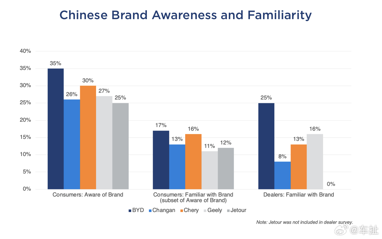 尽管美国消费者对中国汽车表现出兴趣,但他们对具体品牌缺乏了解。比亚迪的品牌认知度最高,达到35%,但只有17%的受访者表示熟悉该品牌。
