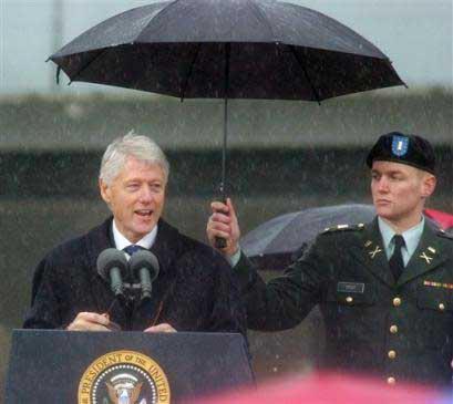 克林顿会耍帅,会摆酷,还会在雨中演讲,有酷酷士兵给他撑伞。他拍照不会让人失望的,看点有的是。
