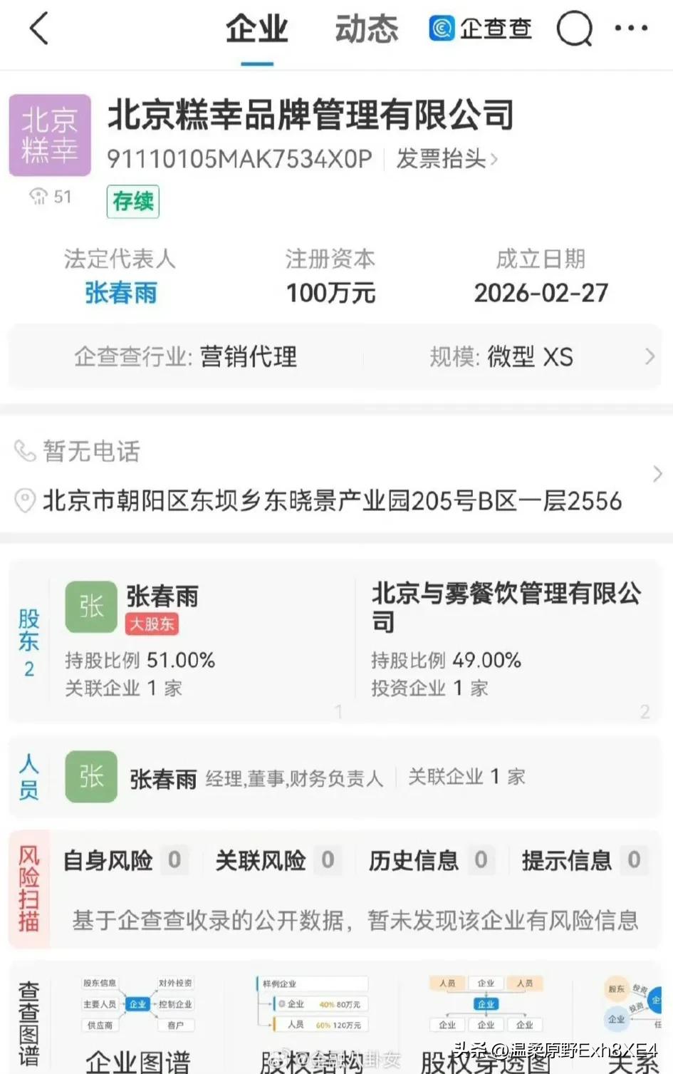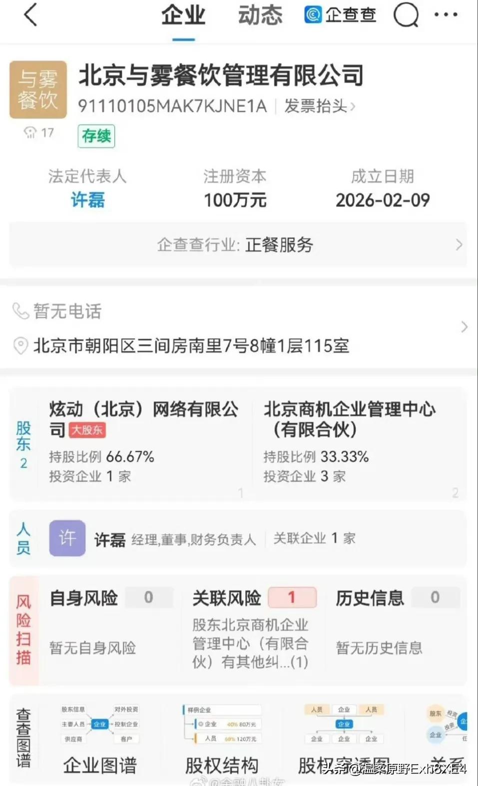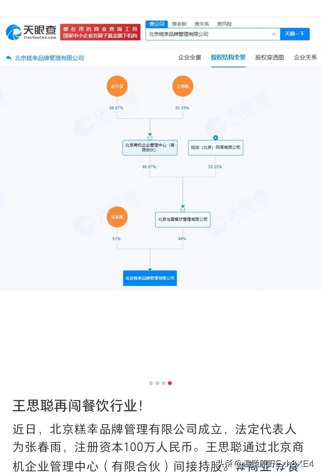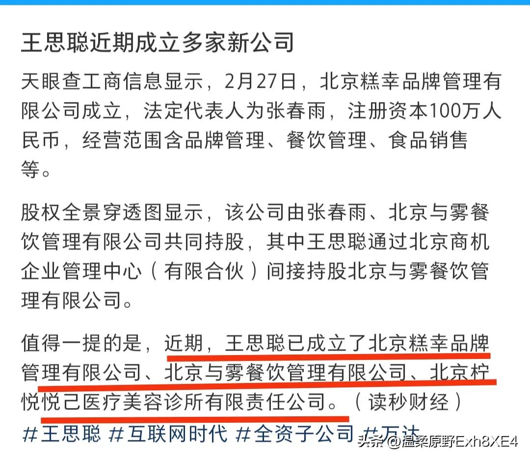 看不懂了,一直在国外的王撕聪,近日接连在国内开公司,又打算创业了? 据天眼查显示,2月27日一家名为北京糕幸的公司成立了,注册资本100万。穿透股权显示,其中王撕聪通过北京商机间接持股。 而在前不久,他才刚成立一家叫北京与雾的餐饮公司。有网友说,全都是集群注册地址,全都是小额走账企业,这不是要大干一场,这是要走前。 可小编觉得他家正在风口浪尖、巨债缠身,老王才刚卖掉上海一家地标式万达,到手20亿左右,他们家应该没这个胆子走前吧? 再说,注册资本才100万,应该是王撕聪在尝试轻资本创业! 对此,您怎么看?欢迎评论区聊聊...