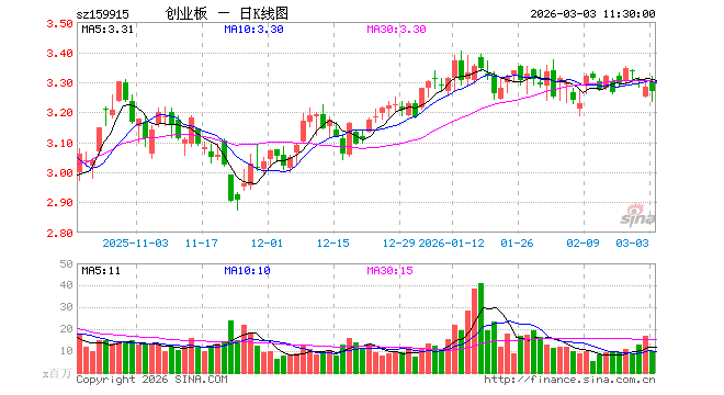 3月3日,截止午间收盘,创业板ETF易方达(159915)跌0.43%,报3.268元,成交额31.94亿元。创业板ETF易方达(159915)重仓股方面,宁德时代截止午盘涨2.71%,中际旭创涨1.96%,新易盛涨2.36%,东方财富涨0.87%,阳光电源涨2.70%,胜宏科技跌2.66%,汇川技术跌1.75%,迈瑞医疗跌1.08%,温氏股份涨1.64%,天孚通信跌1.84%。