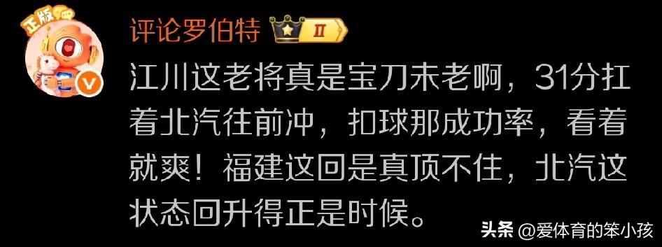 尽管排超联赛的比赛场上男线的比拼似乎永远没有女线比拼那样更为吸引球迷的关注。但是对于北京北汽男排这种强队而言,因为有一些知名球星多年来积累了很大的球迷支持度,球员的个人号召力也很强,所以进入季后赛的争夺,球迷们也会对他们的比赛给予更多的关注,比赛结束后的讨论同样比较热烈,而且这些球星的表现也往往会让大家赞叹不已。 值得一提的是,老牌强队北京北汽在进入季后赛争夺之后,就明显在整个比赛气场和比赛状态的调整方面变得更好了。北汽阵中的领袖级球星老将江川也是在与福建福清男排的比赛当中贡献不俗发挥,个人拿到31分,41扣23中,另有5次拦网和3次发球直接得分。 从江川的个人数据来看,确实有过重大伤病的江川如今如同进入职业生涯第二春,整个比赛当中气场全开,各个技术环节都有不俗发挥。整场比赛也拿到全队最高分。即使是计算净得分,也就是减去他失误和被拦的分数,仍可以达到25分,可见江川在比赛中的发挥的确可圈可点,也为球队的取胜贡献了最关键的一份力量。 用有些球迷的话说,江川的扣球成功率还有进攻端表现让人看着就爽。这样的他,带着球队闯关福建男排继续前进脚步,也只是时间问题。不是吗?大家又如何看待当下江川的这种状态还有整个北京北汽男排的发挥呢?您也说说自己的观点看法,大家交流一下吧。
