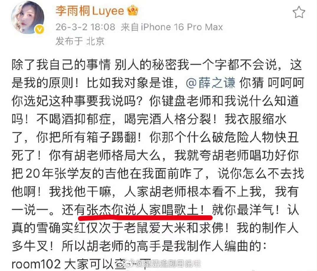 大热闹来了:谢娜直接喊话薛之谦,让他向张杰道歉。主要还是以前的纷争,积怨已久今天爆发了。当时有人猜薛之谦这段吐槽是内涵张杰,不过也有人说是内涵薛另外认识的人事情的导火索,是李雨桐的爆料里提到了张杰,薛之谦之前一直保持沉默,现在谢娜也出来了,应该没办法不回应了吧?谢娜喊话薛之谦薛之谦 张杰薛之谦曾在吐槽大会内涵过张杰
