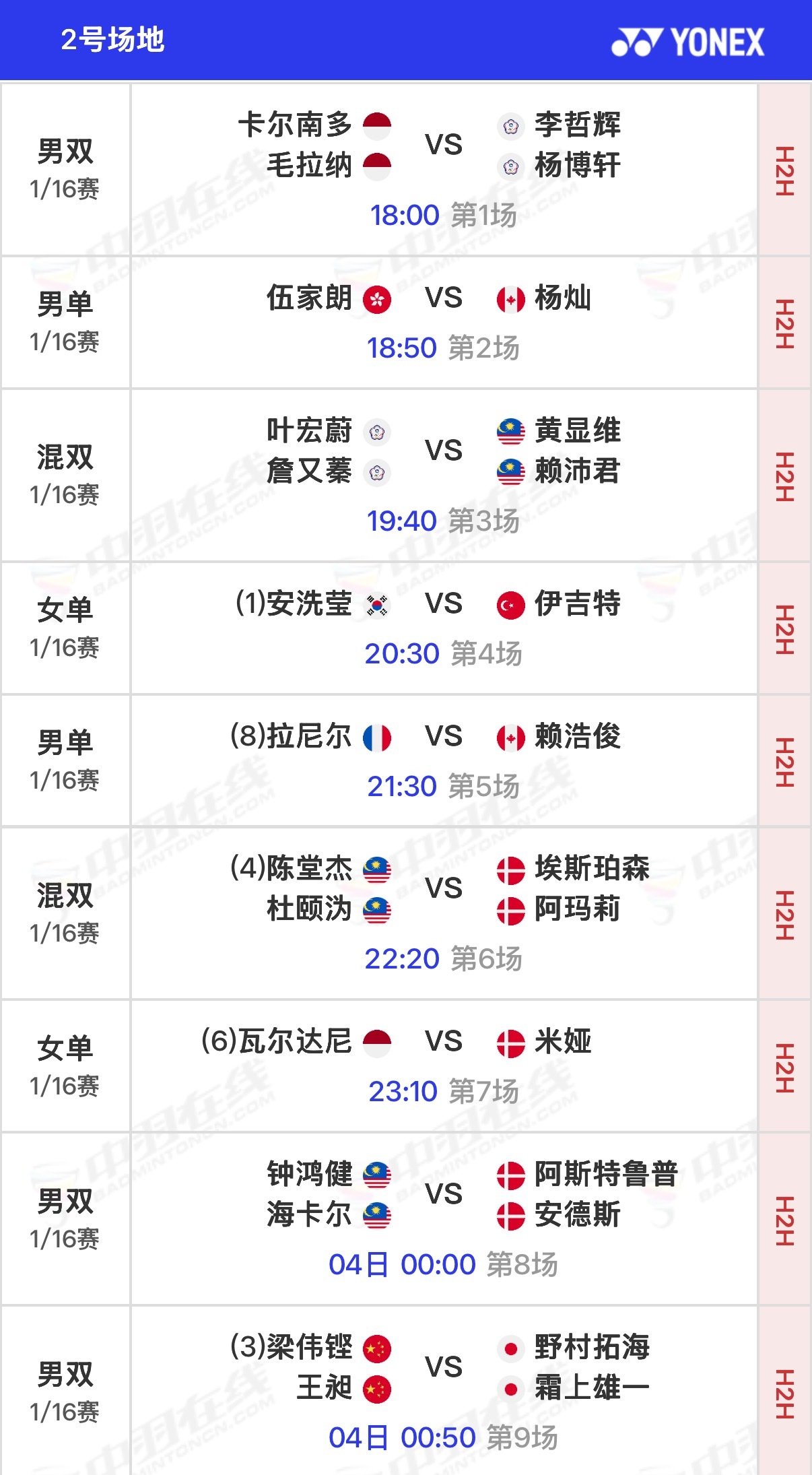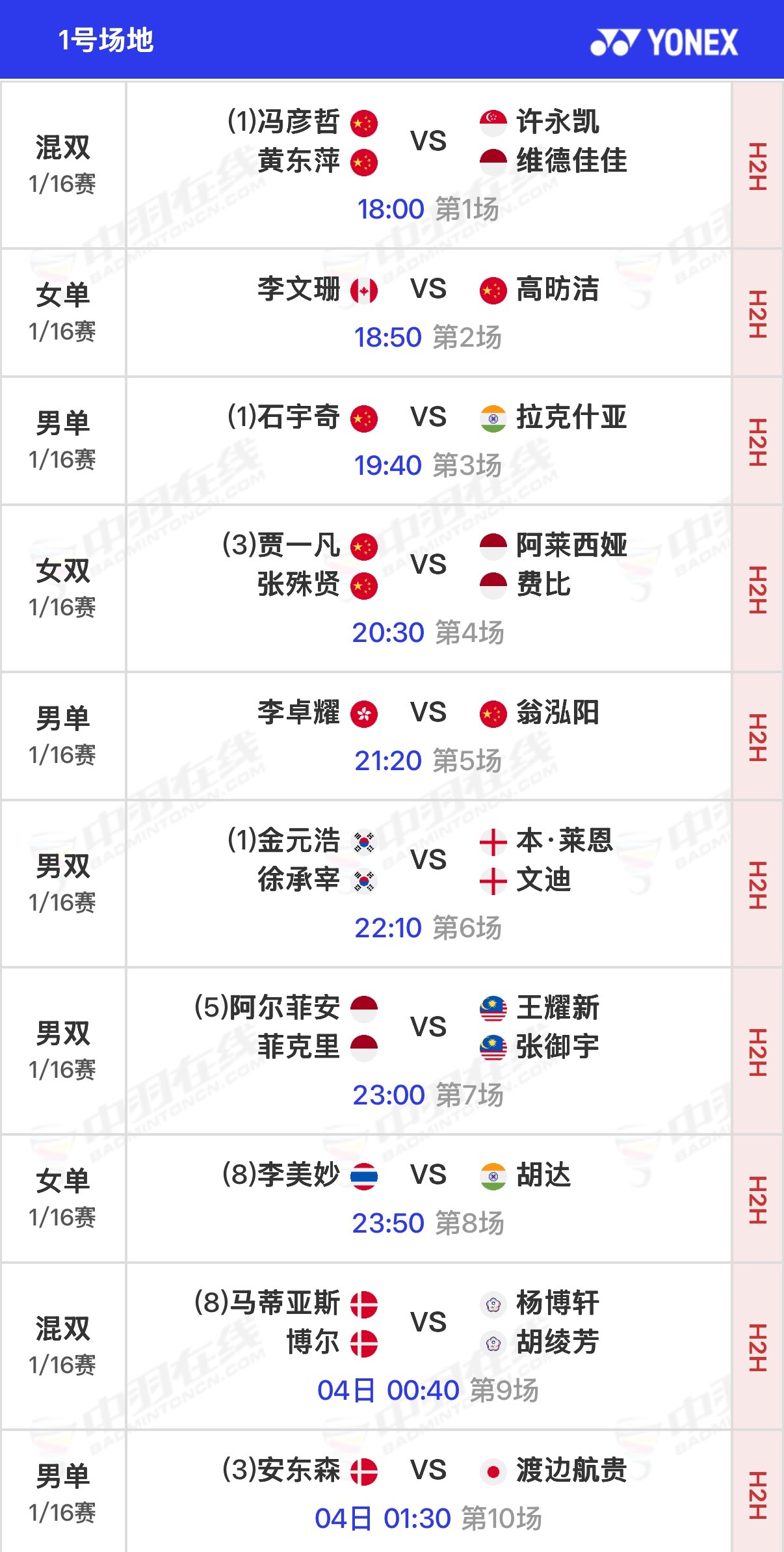 【一号场地】①🇨🇳冯彦哲/黄东萍vs许永凯🇸🇬/维德佳佳🇮🇩②🇨🇳高昉洁vs李文珊🇨🇦③🇨🇳石宇奇vs拉克什亚🇮🇳④🇨🇳贾一凡/张殊贤vs阿莱西娅/费比🇮🇩⑤🇨🇳翁泓阳vs李卓耀🇭🇰