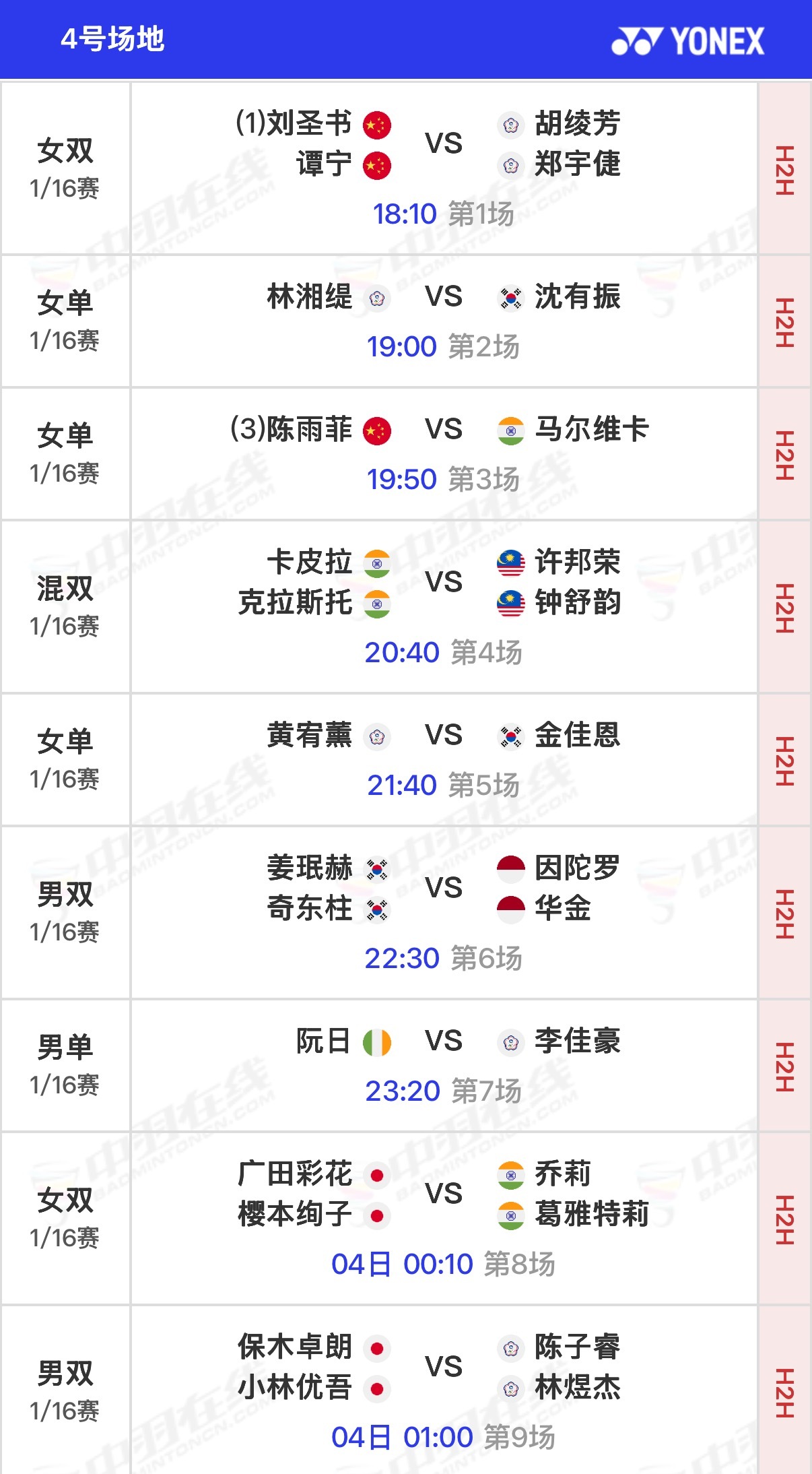 【四号场地】①🇨🇳刘圣书/谭宁vs胡绫芳/郑宇倢ᴛᴘᴇ③🇨🇳陈雨菲vs马尔维卡🇮🇳