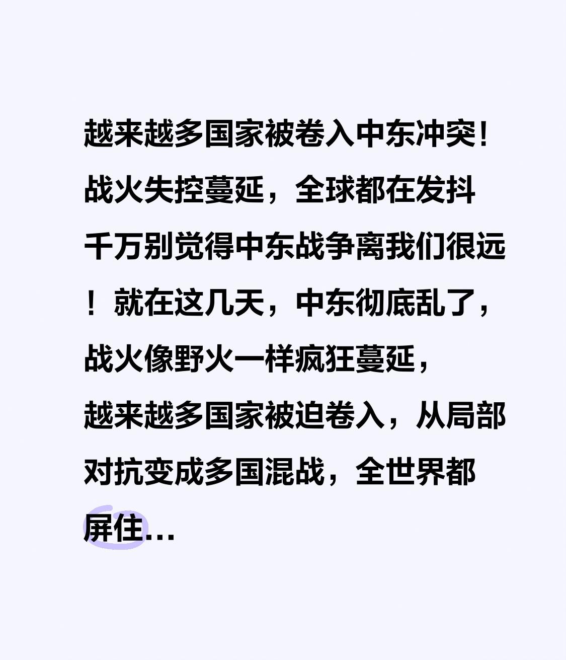越来越多国家被卷入中东冲突!战火失控蔓延,全球都在发抖 千万别觉得中东战争离我们很远!就在这几天,中东彻底乱了,战火像野火一样疯狂蔓延,越来越多国家被迫卷入,从局部对抗变成多国混战,全世界都屏住了呼吸! 一开始,很多人以为只是美以和伊朗之间的较量,打几天就会停火。谁也没想到,冲突爆发短短几天,局势彻底失控。伊朗发动大规模反击,导弹与无人机横扫海湾地区,阿联酋、沙特、卡塔尔、巴林、科威特、伊拉克、约旦等至少9个国家先后被卷入,机场关闭、航班取消、防空警报彻夜响起,平民伤亡不断增加。 更让人意外的是,英国公开介入,法德紧随其后,黎巴嫩真主党、也门胡塞武装全面联动,红海航运受阻,全球能源通道告急。一夜之间,中东从两国冲突,变成了阵营对抗、多方混战的局面,谁都无法独善其身。 转折来了:有人说,这只是远方的战火,和我们普通人没关系。大错特错!中东是世界能源心脏,霍尔木兹海峡一封锁,国际油价暴涨,物流成本上升,接下来就是物价上涨、出行变贵、生活成本增加。战火带来的不只是硝烟,还有全球经济的震荡,每个普通人的钱包都会受影响。 我们生在和平的国家,不懂流离失所的痛苦;我们活在安全的土地,不明白炮火连天的恐惧。当别的国家在逃难、在失去亲人、在废墟里求生时,我们更懂得和平有多珍贵。 这场冲突告诉世界:没有绝对的赢家,只有无尽的伤害。大国博弈,受苦的永远是平民;战火蔓延,遭殃的是普通家庭。 我们不站任何阵营,只呼吁和平;我们不鼓吹战争,只珍惜安稳。愿战火早日熄灭,愿平民远离伤害,愿世界不再有硝烟,愿我们都能在和平的阳光下,平安度日、安稳生活。 和平从来不是理所当然,而是最奢侈的幸福。珍惜当下,愿世界和平!