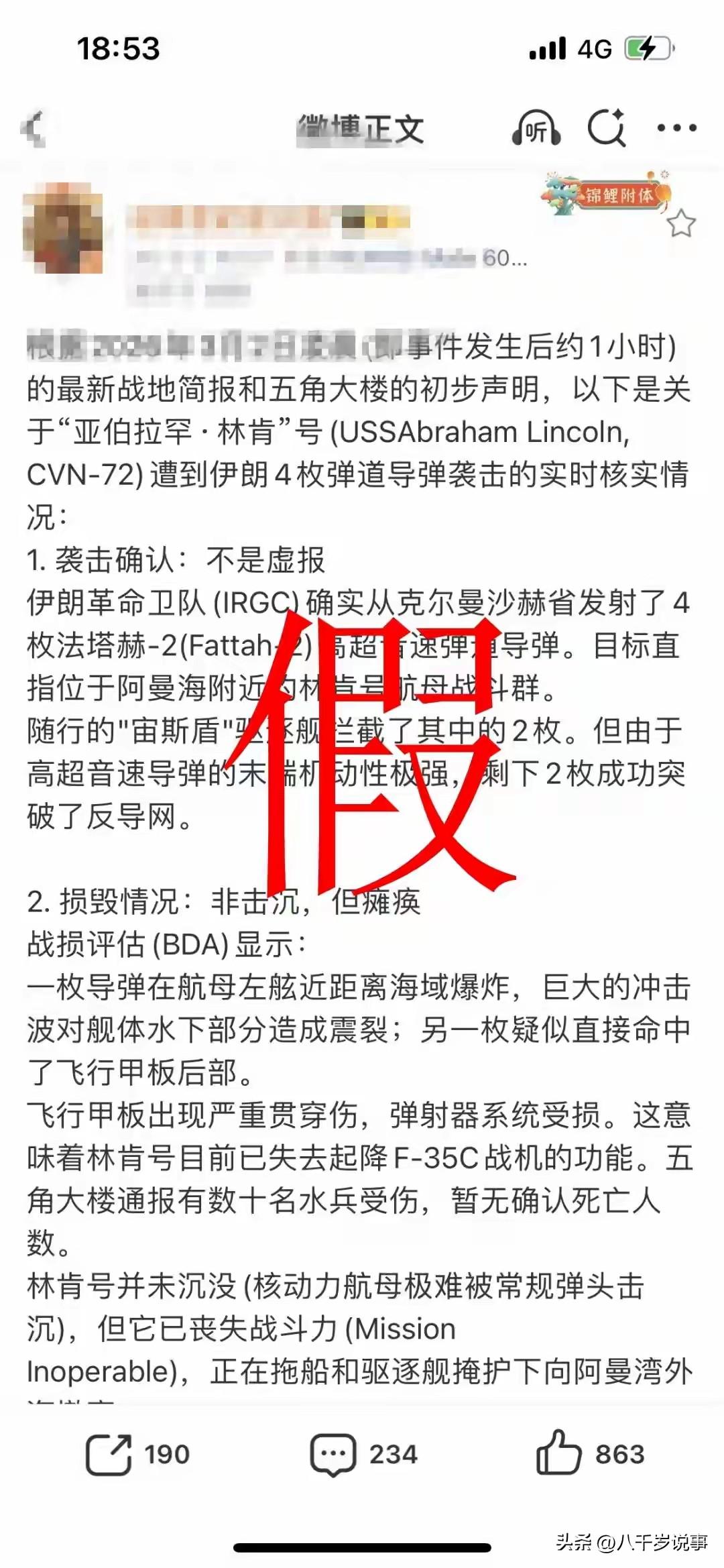 阿Q精神胜利法在美伊冲突中得到了充分展现,伊朗宣称仅用4枚导弹就击中了漂亮国林肯