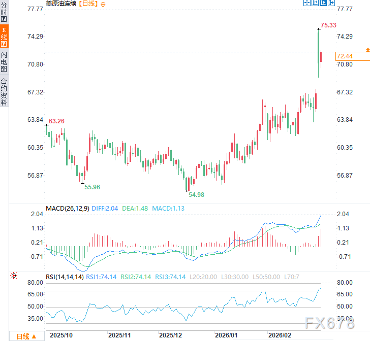 汇通财经APP讯——周二(3月3日)亚市时段,受霍尔木兹海峡紧张局势持续升级影响,美原油价格震荡上行,现交投于每桶72.45美元附近,日内涨幅约1.7%,油价较美伊冲突前显著上涨。