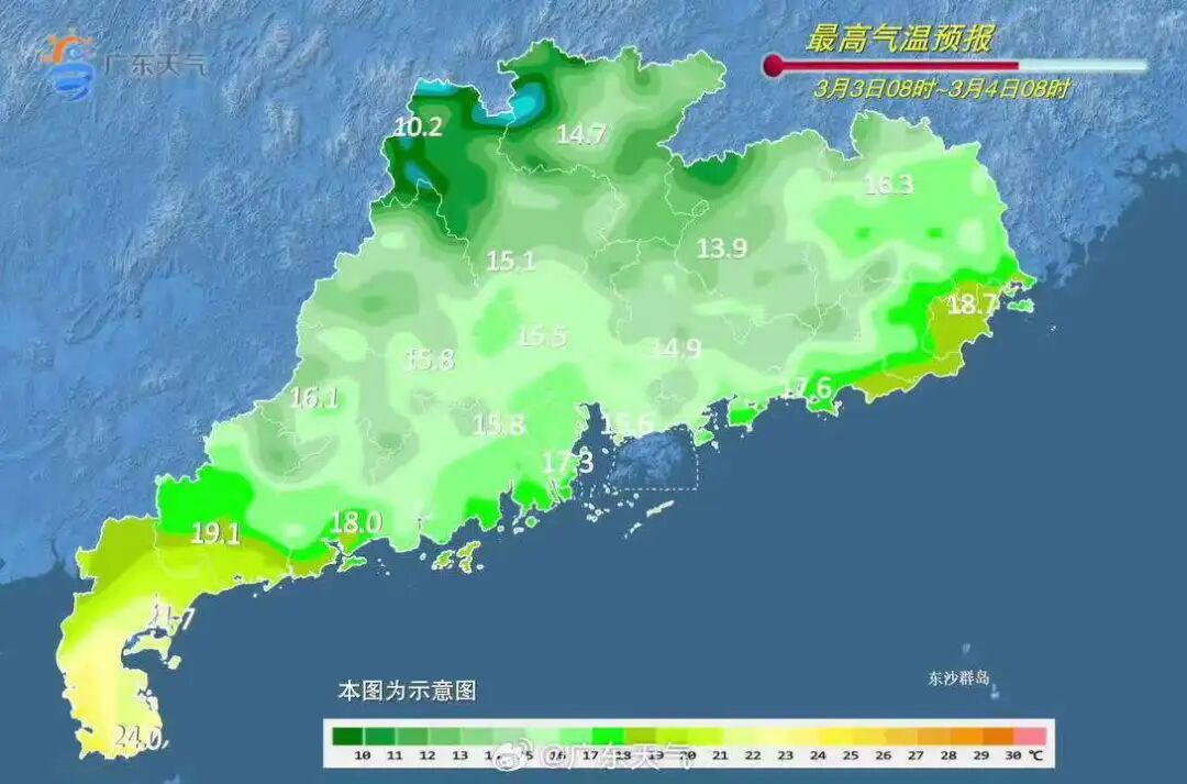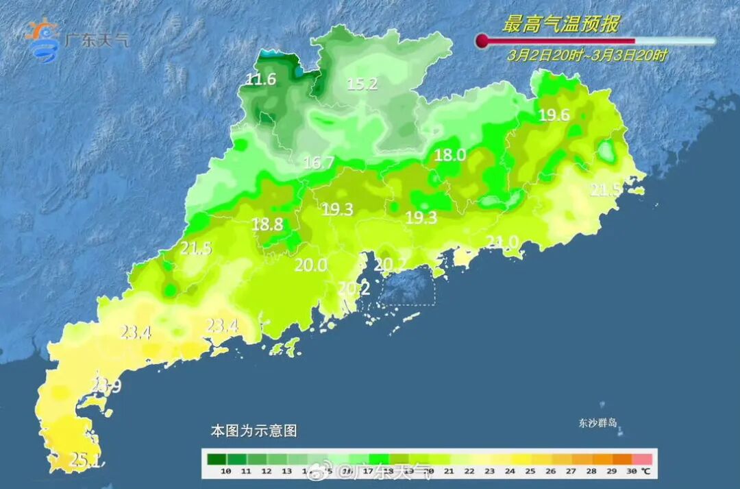 据@广东天气预计,2026年广东3月气候与近30年历史同期相比: