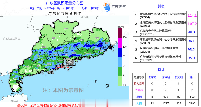 有2个镇街录得超过100毫米的大暴雨