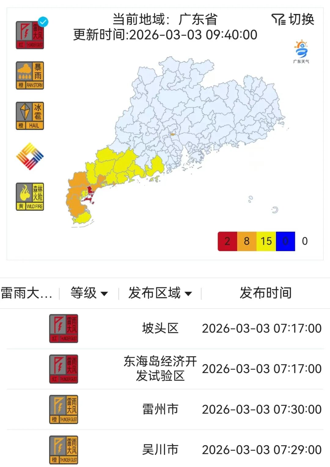 广东多个雷雨大风预警