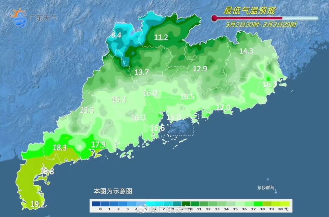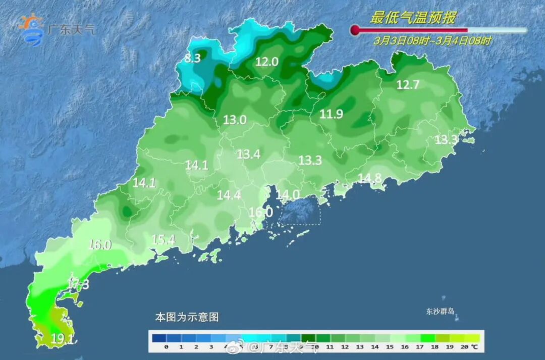 粤西和珠三角南部市县有中雨局部大雨或暴雨,部分市县伴有弱雷电、短时强降水和6~8级短时大风,其余市县阴天有小雨。最低气温:粤北8~12℃,雷州半岛18~20℃,其余南部沿海市县16~17℃,其余市县13~15℃。