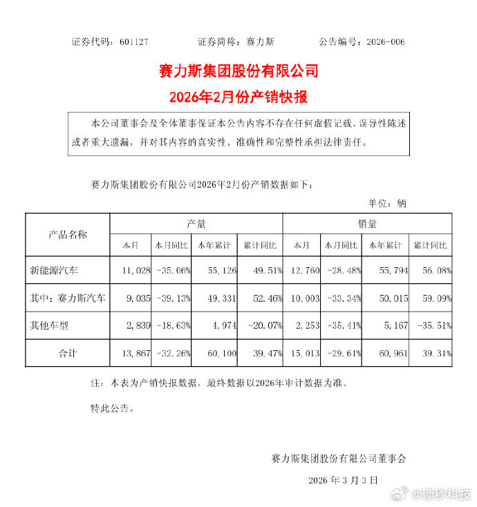【赛力斯2月新能源车销量超1.27万辆赛力斯2月新能源车销量同降28.48%】3月3日,据IT之家,赛力斯集团发布了最新的2026年2月份产销快报。今年2月,赛力斯集团新能源汽车产量11028辆,同比下降35.06%;销量12760辆,同比下降28.48%。各位网友,您怎么看?(IT之家)