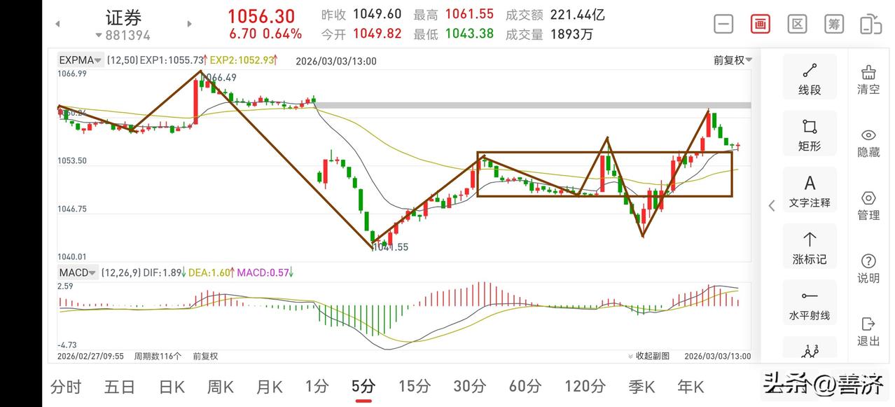 聊聊证券板块(2026.3.3) 今天上午证券板块的走势还是符合预期的,目前在30分钟上已经回补了上方缺口,但总体还在日线一笔的下跌趋势中,还需耐心等待日线一笔调整完成后才会有大的操作机会。 1.从30分钟图一上看,上午基本完成了30分钟的一笔反弹,从而构建了第三个30分钟下跌中枢,下午大概率会再次去探底,所以在操作上可考虑把三成仓位退出来,操作股票时,安全始终是第一位的。 2.从5分钟图二上看,截止上午收盘,目前形成了5分钟的盘整背驰走势,所以下午大概率会是一个震荡下行的走势,当然目前在该级别上是没有走坏的,但上午反弹强度并不大,下午回调的概率还是要偏大一些,我在上午收盘前已把三成仓位退出来了。 总之,大的操作机会还没到来,继续等吧!天南地北大拜年 股票券商