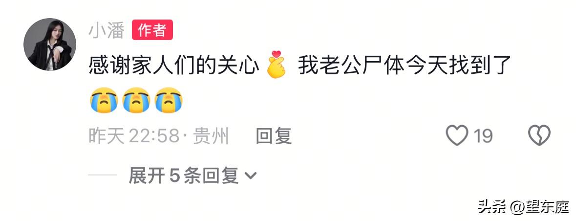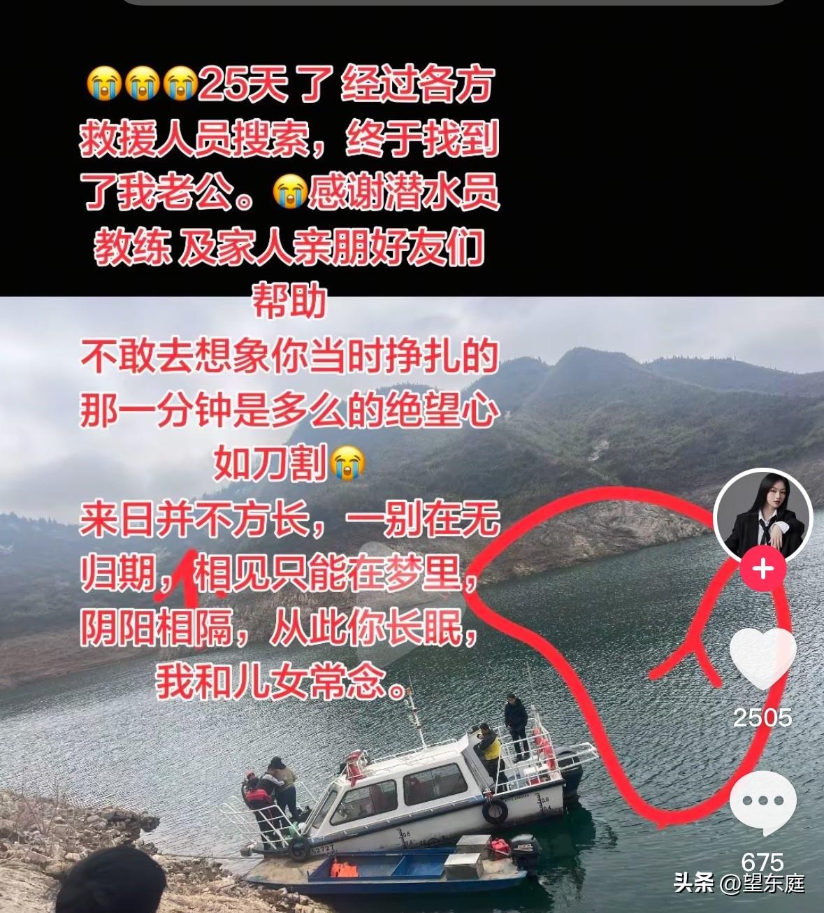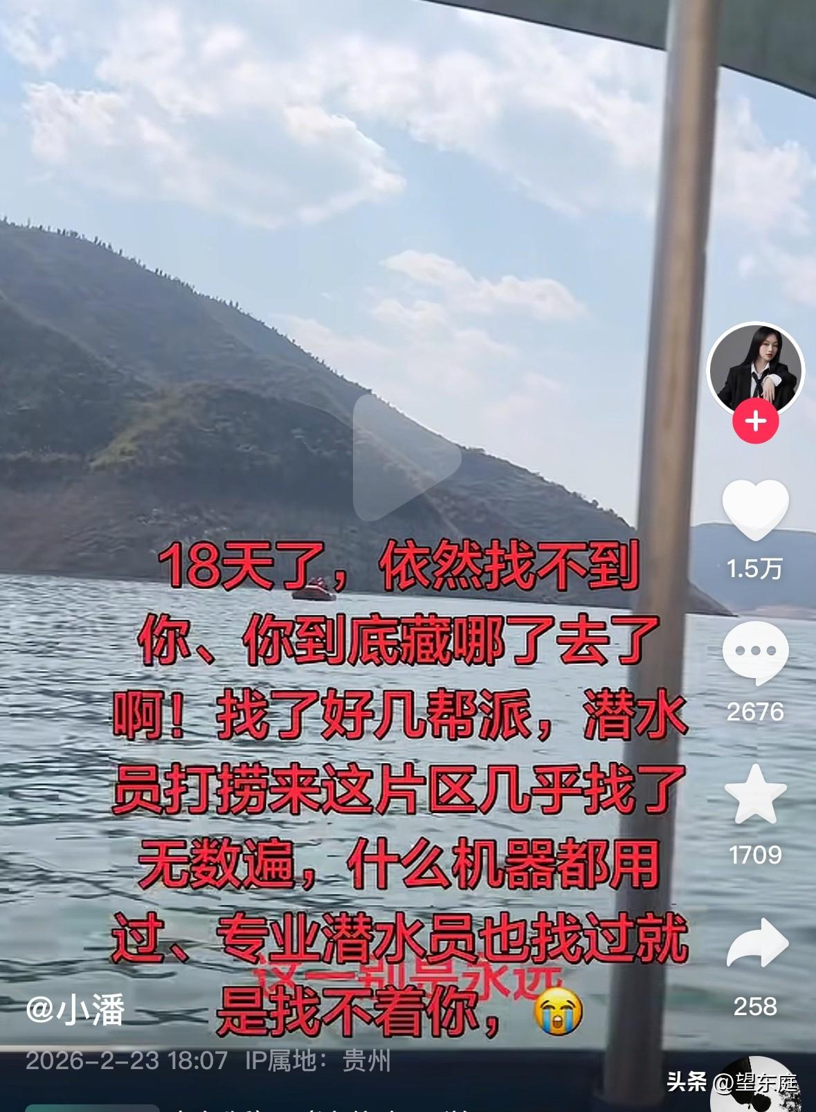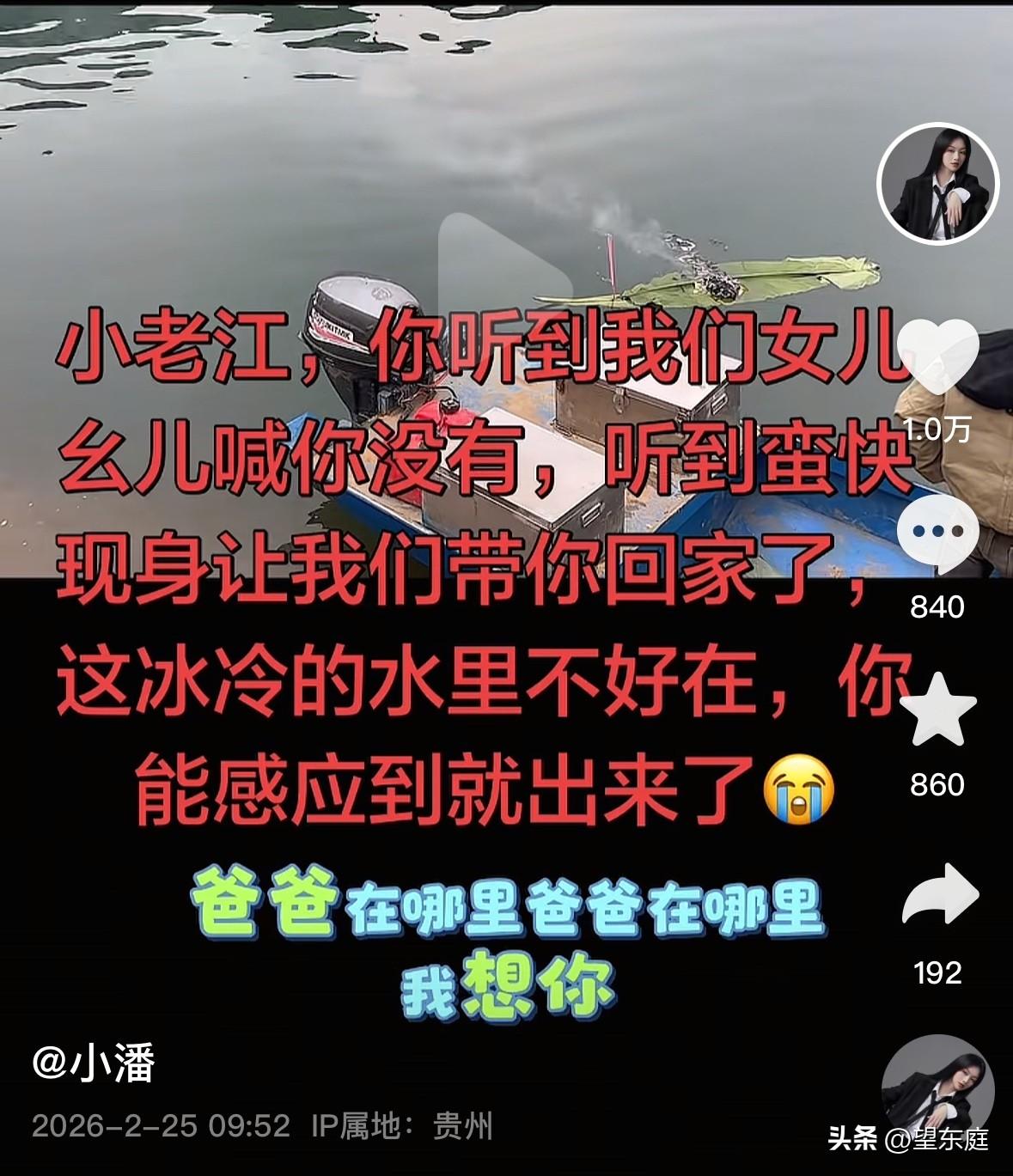 泪目!失联25天的贵州男子遗体终于被找到了。在这个新年前夕,他去潜水抓鱼,不料,这一次竟再没有上岸的机会了! 这名男子名叫小老江,贵州省毕节人。他有一个非常幸福的家庭,不仅有可爱的孩子,还有和他双向奔赴的妻子。 为了让家人过上更好的日子,平日里,他爱好去钓鱼,以便通过这个方式赚点钱补贴家用。 在他家附近,有一条很深的河流,当地人称之为凹水小河沟。河水很深,也很清澈,里面生长的鱼非常受欢迎,一旦抓到是能够卖个好价钱的。 据同村人反馈:去年年底,小老江才购买了一套潜水装备,想通过下水捕获更多的鱼。可没想到第一次下水,悲剧就发生了。 事情发生在2月6日,小老江从家里开开心心出了门。殊不知,这竟是他生命的最后。 自他失联后,家里人就一直在想方设法找他。救援队伍换了一批又一批,小老江却始终杳无音信。他的家人在万念俱灰的情况之下迎来了新年,二十多天的时间里,老老少少都已经疲惫不堪。看着他年幼的女儿在河边一遍遍呼唤“爸爸回家”的视频时,不禁让人泪流满面。 2026年3月2日,小老江的遗体被找到了。时隔25天,他终于可以回家了! 看到小老江的事情后,心里莫名的心酸!作为一个家庭的顶梁柱,他也只是想要赚点外快而已。年前是最冷的一段时间,如果有更好的办法,谁会想冒着冰冷刺骨的寒风,去冷冰冰的水里抓鱼呢? 如今,悲剧已无从改变,只希望他的家人坚强起来,好好的照顾自己的身体、好好抚养孩子长大![祈祷] 通过这个悲剧,希望大家凡事都要慎重!金钱固然重要,但生命第一。留的青山在,不怕没柴烧。没有十足的把握,绝不要贸然下水。请谨记一点:千万不要去很深的水域里冒险。