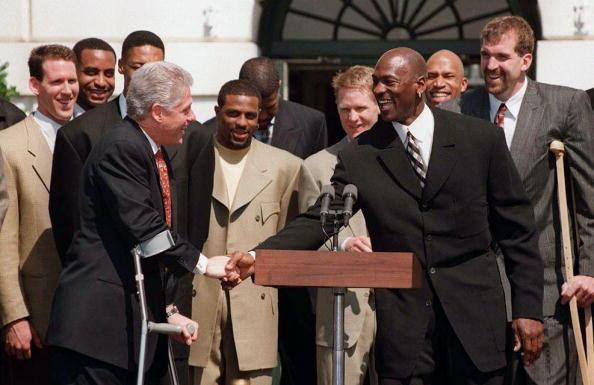 克林顿竟然也有拄着拐杖的时候,拄着拐杖的还有一个大个儿,不过他们都笑得很开心。