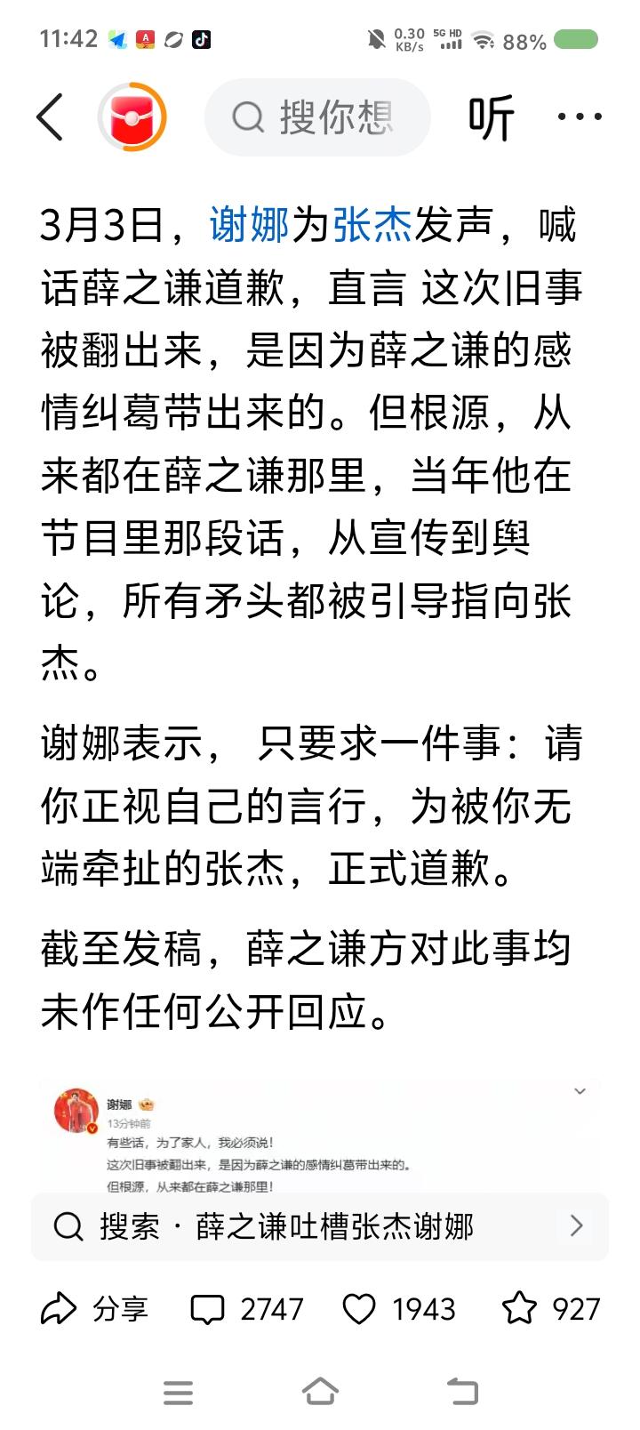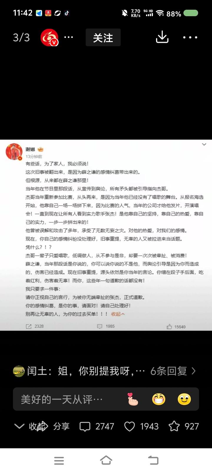 薛某谦得罪谁了?—— 据报道,歌手薛某谦遭前女友发文批评,“重婚罪懂吗”,“杀了我的孩子……” 很快,谢Na为张jie发声,要求薛某谦道歉。 点评: 无语了! 这哪儿跟哪儿?! 首先,如果谁认为自己的合法权益遭侵害,请与当事人沟通,沟通不成,走法律途径。 其次,文艺界的空气质量不好。请有关部门调查此事,如有违法违规行为,严惩。
