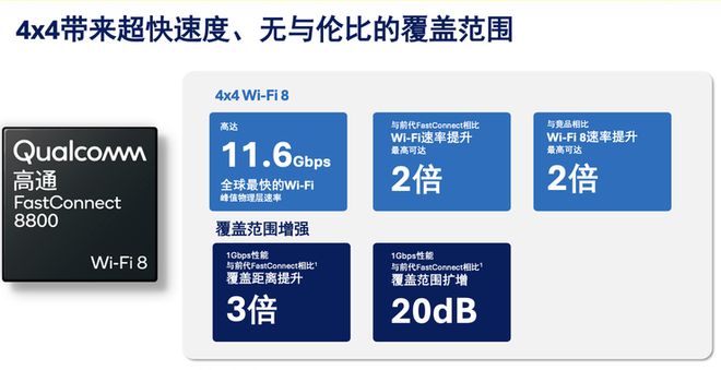 FastConnect8800的发布标志着移动Wi-Fi进入4x4时代,在部分地区,其峰值物理层速率可达11.6Gbps,速率及覆盖距离较上一代提升两倍。与竞品相比,高通的Wi‑Fi8速率是其2倍。