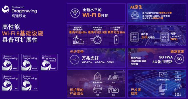 与最新的Wi-Fi平台同步推出的,还有网络侧的5款全新Wi-Fi8高通跃龙网络平台。