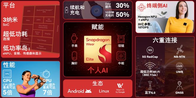 并且,全新骁龙可穿戴平台至尊版引入了首创的多模连接架构,集成六项先进技术:5GRedCap、超低功耗Wi‑Fi、蓝牙6.0、UWB、全球导航卫星系统(GNSS)和窄带非地面网络(NB‑NTN)。