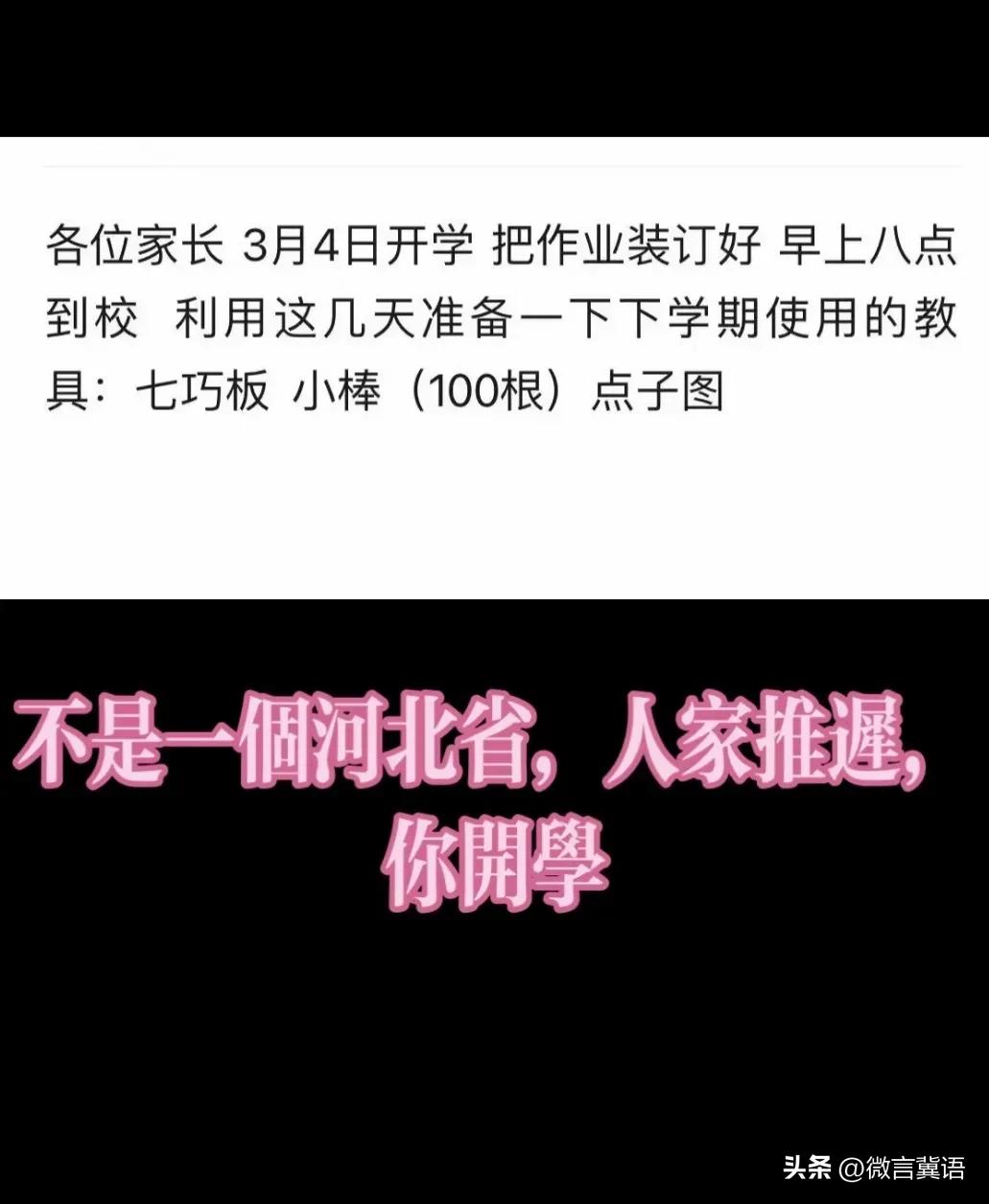 【不可能!推迟开学?】通知,2天后迎来元宵节,3天后学生返校!正月十七正式开学!赤城是哪个市的!不是河北的吧!PS的吧!照片是假的吧? 网友发的视频,说开学时间进行调整:3月7日上午学生开学返校上课,3月13日学生下午正常离校,本周一共在校7天。感觉不太可能!河北省都是统一的明天开学吧! 气人啊!我们明天就要开学了,还有的地区大年初九就开学!再晚点这学期就不剩下几天了……历史最短学期就这个学期呢…… “史上最短学期”,还有的说!这个短学期是我用上个长学期换来的!别忘了上个学期是最长学期! 3月·每日幸运签 信息图片来源网络侵权联删