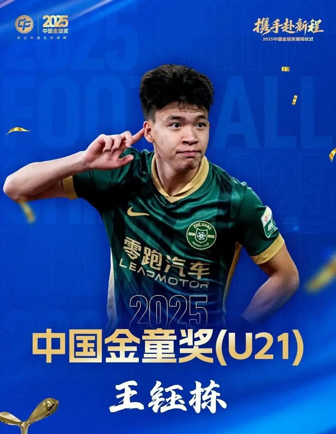 2025中国金球奖颁奖结果出炉,帅惟浩获得中国U17金童奖,王钰栋获得中国U21金童奖,吴曦获得2025中国金球奖,韦世豪和蒋光泰遗憾落败,蒋光太和韦世豪均未出现在颁奖典礼现场;王霜获得中国女子金球奖;邵佳一获得中国金帅奖;刘殿座获得中国金手套奖。 王钰栋获奖后表示:“新赛季马上开始了,我会继续努力,争取下次能拿到金球奖。”为王钰栋的信心点赞,年轻人就应该用这样的追求与自信,希望王钰栋今年再拿下中超本土最佳射手,争取早日出去留洋。 17岁帅惟浩获奖后情绪很激动,他表示:“非常激动和荣幸,感谢教练、队友和家人的支持,这份荣誉属于大家,它不是终点,而是新的起点,我会更加努力刻苦训练,不辜负大家的信任与期待。”帅惟浩懂得感恩,有决心有信心,对未来充满期待,这个品质很难得,希望帅惟浩继续努力,脚踏实地,苦练球技,今年争取在中超尽量争得出场时间,为以后留洋打下基础,看的帅惟浩,帅惟浩潜力无限,加油!