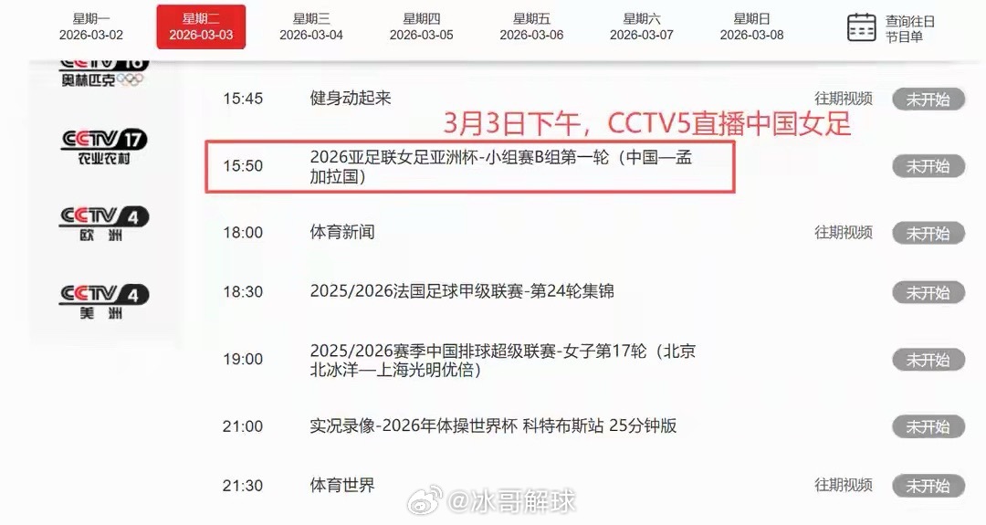 3月3日16:00,2026女足亚洲杯B组首轮,中国女足迎来卫冕首秀,对阵孟加拉国。CCTV5全程直播,王霜、吴海燕等主力领衔出战。