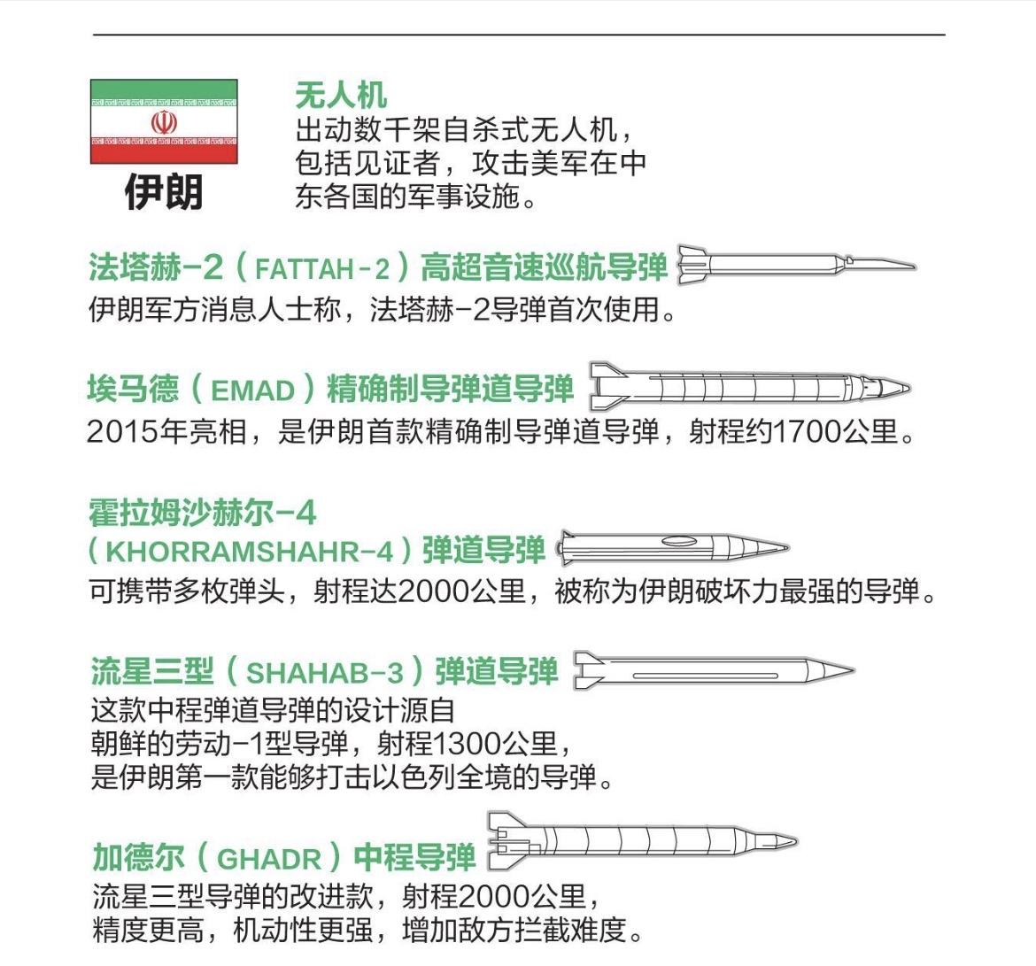 目前美以和伊朗参战的武器对照表显示,美以基本以空中力量打击为主,海上发射战斧导弹为辅。通过轰炸机,先进战斗机,自杀式无人机对伊朗高层人士斩首,军事目标摧毁。 伊朗基本通过各种导弹为主进行反击,自杀式无人机对美军基地,海上舰艇进行辅助打击干扰。 伊朗防空力量基本接近没有,进行不对称抗战。通过导弹的反击,伊朗对美国的军事基地,大使馆,舰艇进行了有效反击。 伊朗的导弹库存决定了这场战争的时间长短、胜负归属、政权存亡。