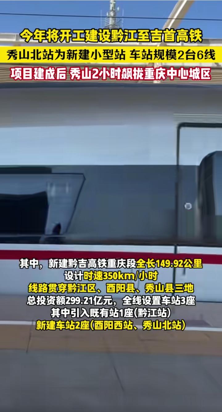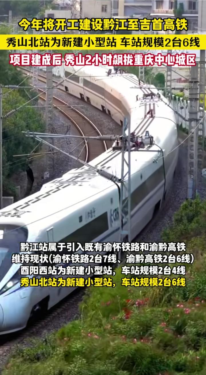 确定开工,重庆黔江至湖南吉首时速350公里的黔吉高铁预计将于2026年下半年开工建设,沿途设酉阳西(2台4线)和秀山北(2台6线)等车站,目前全线正在最后的定测工作,图二和图三为秀山段梅江特大桥定测现场图,黔吉高铁全长约150公里,起于渝长厦高铁黔江站,止于张吉怀高铁吉首东站,沿途主要途经酉阳和秀山还有湘西花垣县等地,2030年黔吉高铁建成开通运营后,重庆主城区坐高铁来往酉阳和秀山的时间将缩短至2小时内,比现在走渝怀线要快一半,黔吉高铁加张吉怀高铁和永清广高铁未来将形成重庆东南部来往广东珠三角城市群最便捷的大通道,永清广高铁预计和黔吉高铁相同或接近的时间开工。