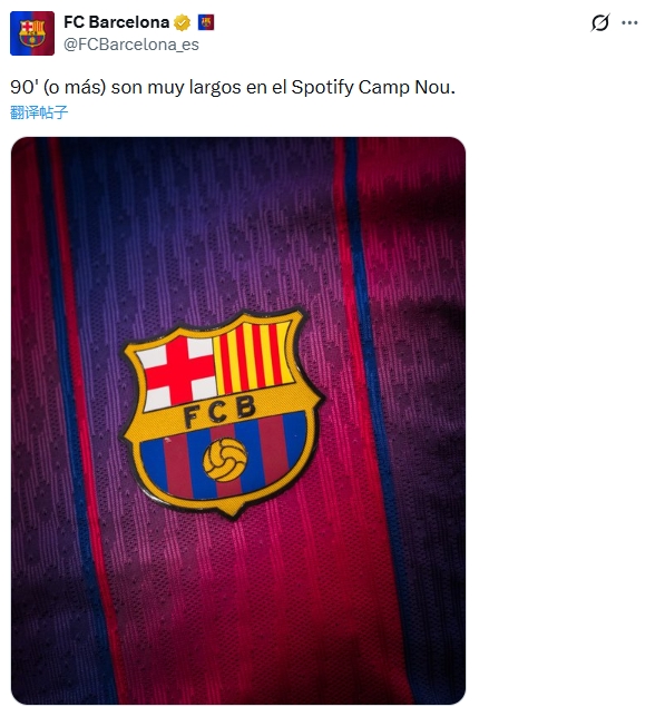 巴萨在社媒发文预热次回合:90'(omás)sonmuylargosenelSpotifyCampNou.(诺坎普的90多分钟非常漫长)