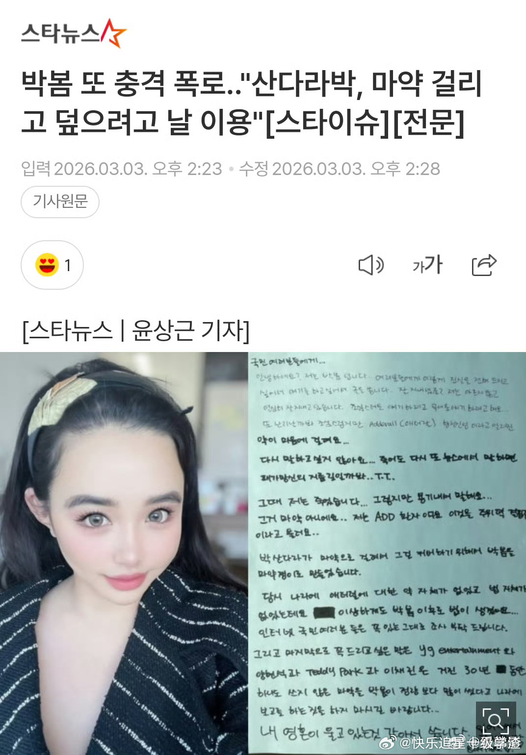 朴春上传手写信说朴山多拉被发现吸毒之后 为了把这事压下来才把自己打造成了吸毒者