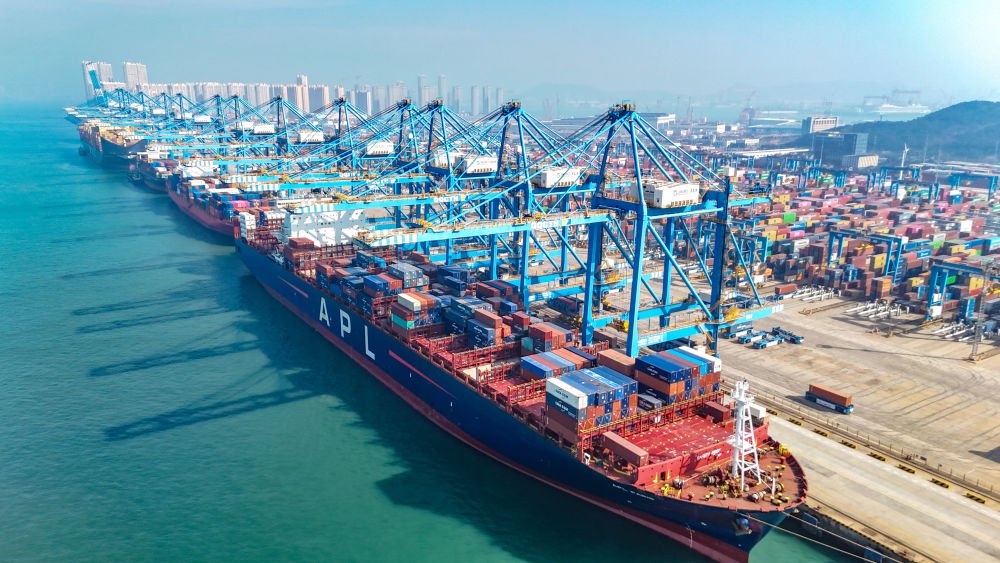 2月4日,集装箱货轮在山东港口青岛港全自动化码头装卸货物张进刚摄