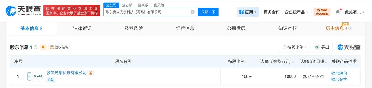 歌尔光学在潍坊成立新科技公司 注册资本1亿 天眼查工商信息显示,近日,歌尔奥来光学科技(潍坊)有限公司成立,法定代表人为饶轶,注册资本1亿人民币,经营范围含光学仪器制造、光学仪器销售、虚拟现实设备制造、显示器件制造、显示器件销售、电子元器件制造、电子元器件批发等。股东信息显示,该公司由歌尔光学科技有限公司全资持股。 天眼查信息:
