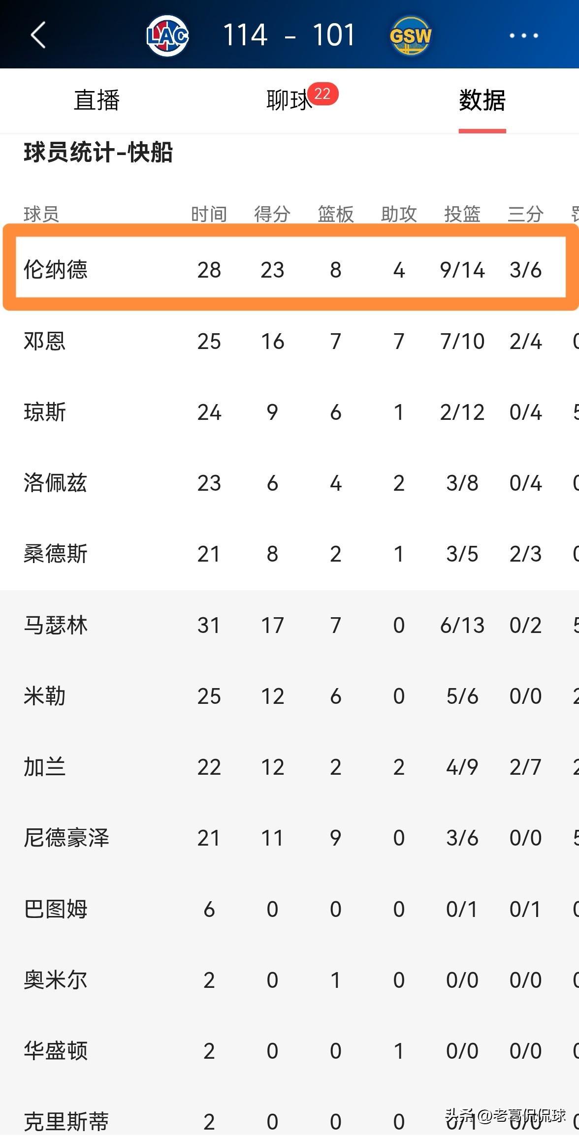 快船超级球星伦纳德真是无可阻挡!在今天快船客场以114:101逆转击败勇士的比赛中,伦纳德再次在攻防两端都打出了极具说服力的表现,即便勇士全场比赛对伦纳德采用包夹防守,依然无法限制伦纳德的发挥。 整场比赛下来,伦纳德首发出战28分钟,投篮14中9,其中三分球6中3、罚球2中2极其高效的砍下23分,还有8篮板4助攻2抢断,他的场上正负值为+16。 老实说,这就是伦纳德的巨星成色,这就是快船不肯交易伦纳德的原因。