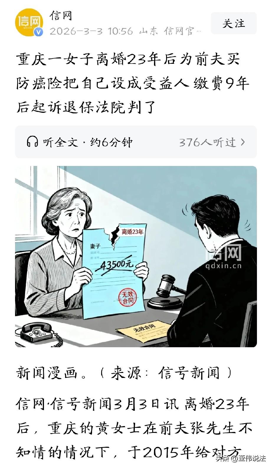 失算了!重庆,女子和前夫离婚23年后,心里还有怨气,便赌对方会得癌症。于是,她悄悄给前夫买了一份老年防癌保险,指定受益人是自己,还连续缴纳了9年保费,每年5000年。但天不遂她的愿,前夫身体健康,没有任何患病的迹象,女子怕这笔钱打了水漂,干脆将保险公司告上法庭,要求退还保费。这番操作,让保险公司彻底傻眼。 黄女士和前夫张先生早在1992年就结束了婚姻关系,此后两人各自生活,几乎没了交集。 然而,黄女士心里还有怨气,并滋生出一个阴暗的想法。她觉得张先生年纪渐长,身体说不定会出问题,尤其是患上癌症这种严重疾病。 抱着一种近乎赌徒的心态,她盘算着,要是给张先生买份老年防癌疾病保险,指定自己为受益人,万一张先生真不幸患癌去世,那自己就能拿到一笔保险金,这岂不是一笔“意外之财”? 2015年5月,她来到富德生命人寿保险公司购买了一份老年防癌疾病保险,被保险人正是她早已离婚多年的前夫张先生。 在填写投保资料时,业务员其实知晓黄女士已经离婚的情况,可为了促成这单交易,她竟睁一只眼闭一只眼,让黄女士在“与被保险人的关系”一栏里填上了“妻子”。 这份保险每年保费要5000元,对于黄女士来说,这可不是一笔小数目。 但一想到未来可能获得的巨额保险金,她咬咬牙,还是开始每年按时缴纳,这一交,就是整整9年。 这9年里,黄女士每次交保费时,心里都五味杂陈。 一方面,她心疼这些钱,毕竟这是一笔不小的开支;另一方面,她又满心期待着张先生能早日患癌,这样自己的“投资”就能得到回报。 然而,天偏偏不遂她的愿。张先生这些年身体一直还算硬朗,并没有如黄女士所愿患上癌症。 看着自己这些年交出去的一大笔保费,黄女士越想越不甘心,白白花了这么多钱,却什么都没得到。 既然拿不到保险金,那这保费就不能白交,于是,她想让保险公司把钱退回来。 黄女士开始仔细研究保险合同和相关法律条款,她发现《保险法》里规定:投保人对被保险人不具有保险利益的,合同无效。 她心里马上有了主意,因为心想自己早在1992年就和张先生离婚了,所以,这份保险合同应该就是无效的。 于是,她将保险公司起诉到法院,要求保险公司返还她这些年交的保费,还要支付资金占用损失。 接到起诉后,保险公司觉得十分荒谬。他们称,是否具有保险利益,这应该是投保人按照诚实信用原则主动如实告知的事项,是投保人的法定义务。 黄女士在投保资料里填的,和被保险人是夫妻关系,而且在后续电话回访的时候,也没否认“爱人”这个关系。 就算要认定保险合同无效,那也是黄女士自己有严重过错导致的。 他们还认为,黄女士完全是故意隐瞒离婚事实,企图骗取保险金,现在没达到目的就想耍赖退保费。 而黄女士的前夫张先生,直到2023年才知道有这么一份保险存在,感到十分震惊和愤怒。 她明确表示,保单上的签名根本不是他本人签的,而且也坚决不同意前妻给他投保的行为。 法院审理认为,黄女士购买保险的时候,和被保险人张先生在法律意义上已经不存在家庭成员或者近亲属关系了,而且张先生也明确表示不同意投保。 虽然保险公司拿出了和黄女士的通话录音,录音里黄女士没否认和被保险人的“爱人”关系,但这些证据根本不足以证明保单上的签字是张先生本人签的。 保险公司也没有办法提交证据证明,在销售保险的时候,张先生同意黄女士替他投保,所以,得承担举证不利的后果。 最终,法院判定这份保险合同无效,不过,不支持黄女士关于资金占用损失的诉求。 目前,保险公司已经把黄女士这些年交的43500元保费返还给了她。 对此,你怎么看?