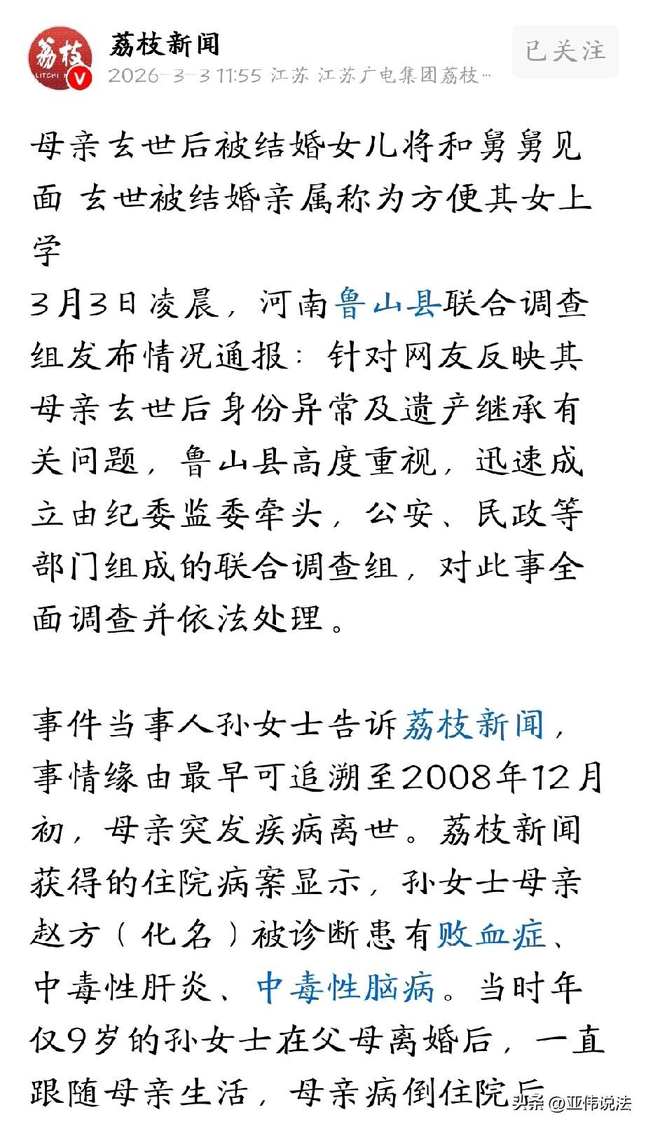这是要吃绝户!河南平顶山,母亲去世后,9岁女儿的抚养权被转给小姨。10年后,女子得知母亲有房产和商户等,希望继承母亲遗产。谁知,办理手续时竟发现,母亲去世第二年,竟然被结婚,结婚对象是自己的亲舅舅,户口也没有被注销,变成了舅妈的脸。更可恶的是,母亲去世才14天,小姨就顺手变卖了母亲留下的房产。网友惊呼:这是真正的吃绝户呀! 2008年12月,9岁的孙女士在医院见到了母亲最后一面,当时母亲赵芳病得很重,躺在病床上昏迷不醒。 孙女士还不知道,这是她这辈子最后一次见到妈妈。 母亲得的是败血症,在医院住了一段时间,那天孙女士正守在病床边,突然被小姨从医院带走,之后她只从亲戚嘴里听说,母亲走了。 至于人是怎么走的、埋在哪儿,没人告诉她,连葬礼都没让她参加。 一夜之间,孙女士成了没妈的孩子,她爸和妈早就离了婚,她被判给了妈妈。 现在妈妈没了,小姨出面,跟她爸签了个收养协议,从此孙女士就跟着小姨一家过。 日子一天天过去,孙女士慢慢长大。有时候她想爸爸,想见一面,但小姨一家总是拦着,不让她见。 一晃就是十年,直到2018年,孙女士19岁了,开始懂事,因为她知道,妈妈生前在石家庄有房产,还有商铺做些生意,还留不少珠宝首饰。 可等她去办继承手续时,遇到了想都想不到的事。 公证处的人告诉她,办不了,因为查到她妈妈还有其他婚姻记录,没法证明她是独生女。 孙女士懵了,妈妈就结过一次婚啊,就是跟她爸,哪来的其他婚姻? 她不放心,跑去查母亲的户籍档案。这一查,查出一身冷汗。 档案里赫然有一份再婚登记,时间是2009年12月,可妈妈是2008年12月走的啊,都去世一年了,怎么还能结婚? 再仔细看结婚证上的照片,女的确实不是她妈,而是她大舅妈,登记对象竟然是她的亲舅舅。 孙女士整个人都懵了,脑袋嗡嗡响。她继续翻档案,发现妈妈去世后根本没注销户口,户口反而从石家庄迁到了平顶山。连妈妈的身份证照片都被换了,换成了大舅妈的脸。 她拿着妈妈的死亡注销证明一看,上面的照片也不是妈妈,还是大舅妈。 这还不算完。孙女士又查到,妈妈去世才14天,就有人用她的名义办了份房产委托书,把石家庄的房子卖了,卖房的钱,转到了她小姨收的账户。 孙女士想起这十年被拦着不让见爸爸,想起自己被小姨一家收养,想起妈妈的遗产她一分都没见着,这桩桩件件,让她心里一阵阵发凉。 她去找舅妈质问,但得到的解释是,当年这么做,是为了解决她上学的问题。 孙女士不信,但也不知道该怎么办。十几年了,妈妈到底怎么走的?谁给她办的假结婚?谁动了她妈妈的财产?她该找谁问? 今年3月,孙女士把这事发到了网上。网友们看了都炸了,9岁没了妈已经够可怜了,亲人还联手算计她,就是为了霸占遗产,妥妥的“吃绝户”,人死了还要扒层皮。 事情闹大了,平顶山鲁山县出了通报,说已经成立联合调查组,要全面调查,依法处理。 希望调查组能彻查到底,把财产还给孙女士,严惩这些昧良心的人。 《刑法》第二百八十条规定:伪造、变造、买卖居民身份证、护照、社会保障卡、驾驶证等依法可以用于证明身份的证件的,处三年以下有期徒刑、拘役、管制或者剥夺政治权利,并处罚金;情节严重的,处三年以上七年以下有期徒刑,并处罚金。 舅妈冒用逝者身份、伪造死亡证明与户籍信息,小姨伪造委托书变卖房产并占有房款,均符合本条伪造、使用虚假身份证件的构成要件。 同时,他们涉嫌诈骗与侵占遗产,应依法追究刑事责任。 孙女士作为母亲唯一法定继承人,亲属通过虚假手段取得的财产均属不当得利,应全额返还遗产,相关虚假登记与交易可依法撤销。