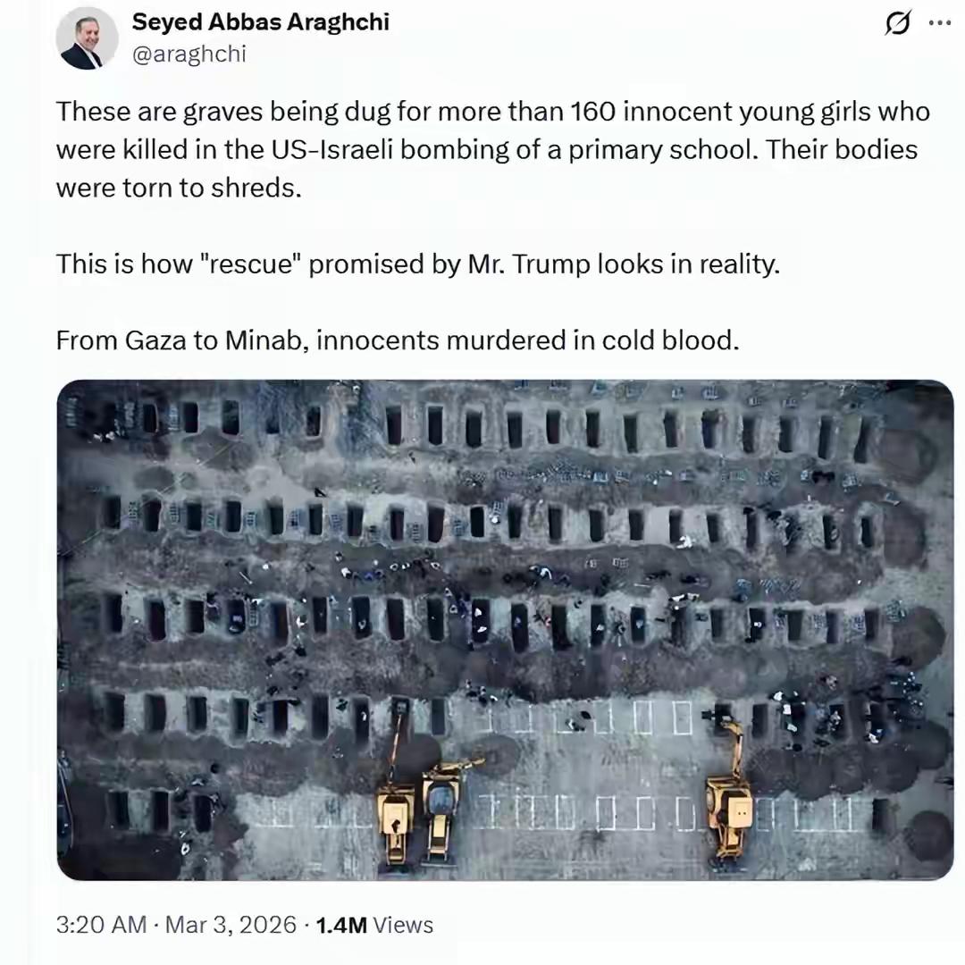 160个坟墓,160条人命,160个凋零的花朵! 看看下面的图片吧。这是伊朗为在美以导弹袭击死难的165名7-12岁女孩挖掘的坟墓。它们像是160多个愤怒的眼睛怒视着美以,怒视着特朗普和内塔尼亚胡! 3月3日,伊朗外长阿拉格齐在社交媒体X上发文说:“这是为160多名在美以对小学的轰炸中丧生的无辜少女挖掘的坟墓。她们的身体被炸得支离破碎。这就是特朗普先生承诺的‘救援’在现实中的样子。从加沙到米纳卜,无辜者被冷血屠杀。” 美以导弹袭击,炸毁了一所女子小学,瞬间165名花季少女死亡。从伊朗外长的这段文字中,明显的感受到伊朗人民的愤怒和反美情绪。美以的行径,这绝对触犯了战争罪,是要受到审判的!