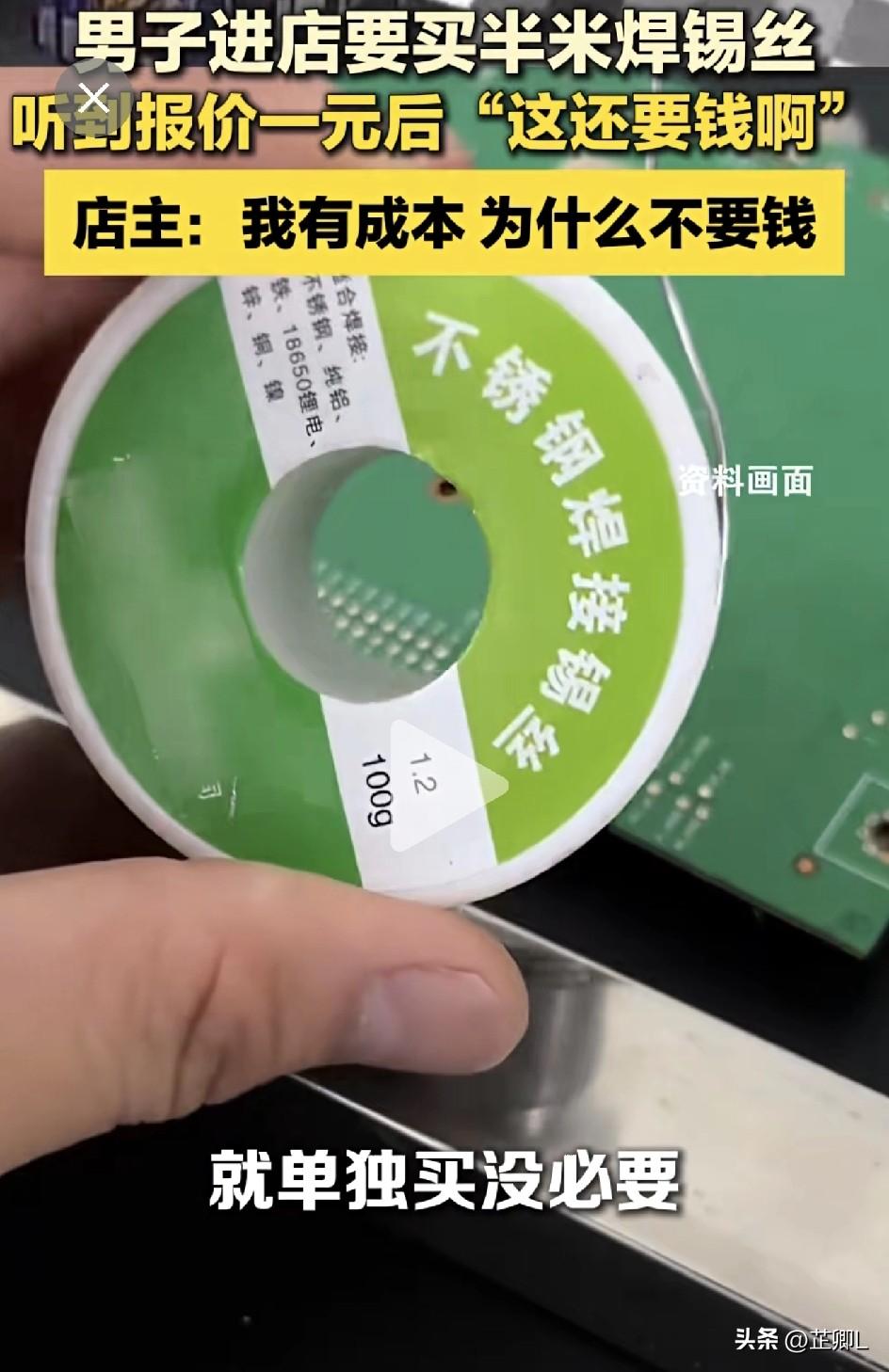 陕西一男子进店“要”焊锡丝,老板收1块被怼:这还要钱?店主一句话回得太解气!网友:干得漂亮! 3月2日,有媒体报道了发生在陕西的一件小事,事真的不大,却让很多人看完特别有共鸣。 一男子走进手机店,说要一段半米长的焊锡丝,临时用一下。老板很实在,直接说:一块钱。 结果男子当场就不乐意了,直接来了一句:“这还要钱吗?” 言外之意就是:就这么点小东西,你还好意思收钱? 老板一点没惯着,直接回怼: “这我买的为啥不要钱?我是修手机的,这是进口焊锡丝,几十块钱都买不到一卷,我也是有成本的!” 就这么一段小小的焊锡丝,看似不值钱,却是人家开店做生意的耗材,每一分一毛都是人家辛辛苦苦挣的,不是大风刮来的。 不能因为价值不高,就把别人的成本,当成你理所当然的免费。 就像一个网友说的:“你如果主动给钱,老板还真有可能不收!” 这件事虽然看上去很小很小,不值得一提。但它却戳中了很多小生意人、打工人的痛点:现在总有一类人,爱占小便宜,还理直气壮。 💢觉得东西不值钱,店家就该免费给; 💢自己图方便,却从不考虑别人的成本; 💢把“客气”当“应该”,把“人情”当“义务”。 焊锡丝是不贵,但1块钱买的是规矩,不是小气。 人家开门做生意,房租、材料、时间全是钱,又不是你的爹娘,真的没有义务为你的“临时用一下”无条件买单。 真正懂事的人,不会因为一点小东西就白拿白要; 真正懂分寸的人,都会尊重别人的劳动和成本。 所以,千万不要用“不值钱”三个字,去消耗别人的善意。小便宜占多了,丢的是人品,败的是人心。 素材来源:翼时新闻,侵联删!