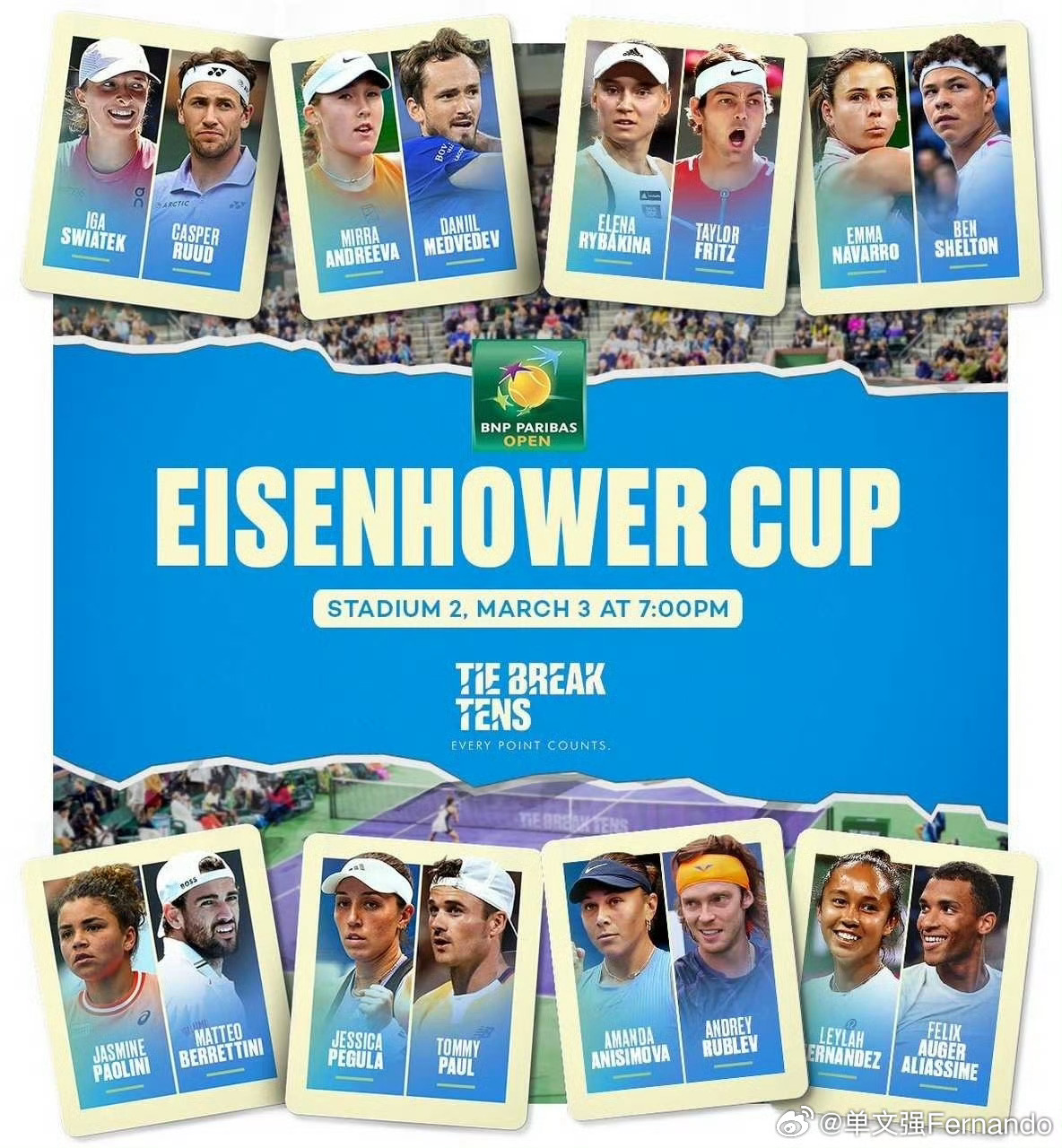 印第安维尔斯混双阵容更新🚨明早开打!阿尼西莫娃🤝勒纳·钱(顶替卢布列夫)米拉·安德列娃🤝布伯利克(顶替梅德韦杰夫)Daniil和Andrey两位由于还在试图从迪拜飞赴美国参加IW的路上,所以确定无法赶上北京时间明天早上10时的表演赛了!