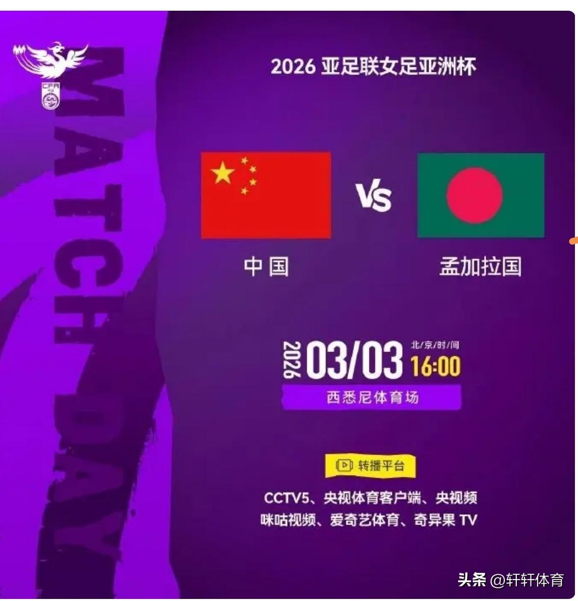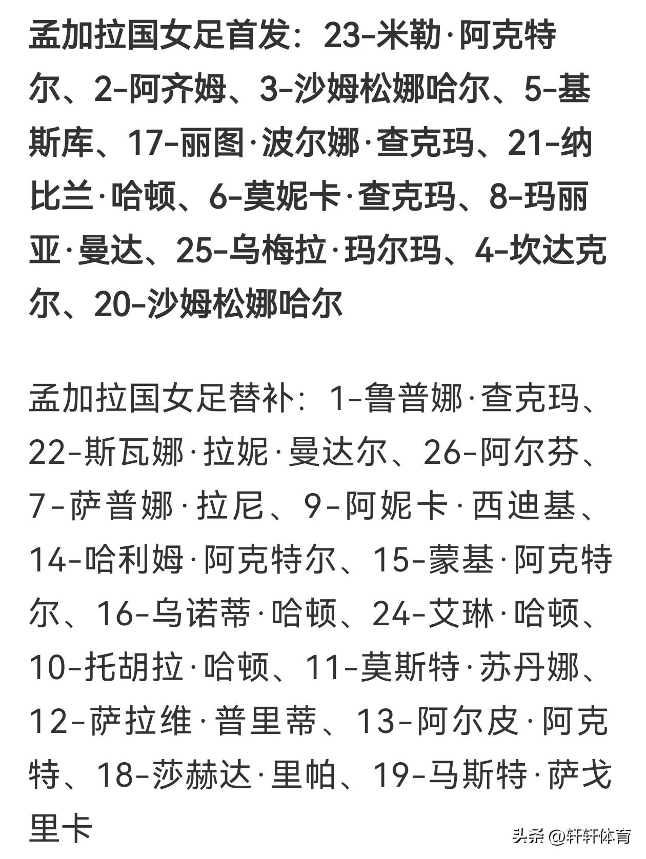 女足亚洲杯小组赛赛首轮对阵孟加拉女足,首发阵容以公布中国女足金球得主王霜领衔,中国女足阵型4-4-2前锋乌日古木拉与金坤组成,中场王霜、王爱芳、刘婧、张睿,后卫线张程雪、吴海燕、汪琳琳、吕亚童,门将陈晨,首发平均年龄29岁正值当打之年,孟加拉主打4-5-1防守反击阵容,前锋米勒顶在最前面,孟加拉平均年龄20.8岁是一支相当年轻的球队。