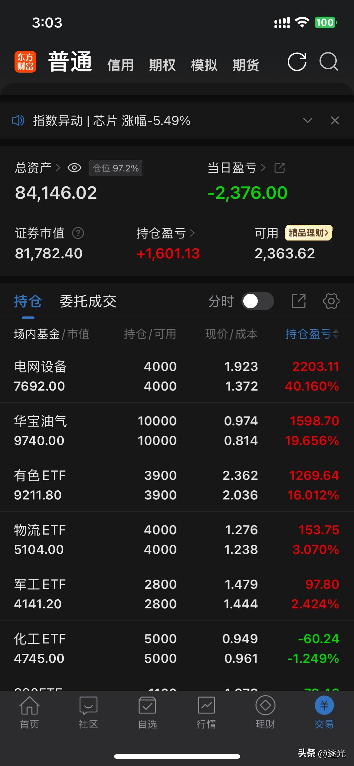 亏麻了,下午不断地🈹肉,卖了开发和冰川,尾盘买了华胜。仓位20%不到,手上两个跌停。今天真狠。 ETF全靠华宝油气和物流撑场。收盘亏5千出头了[捂脸]。这个月目标是少亏,如能扭亏就非常理想了。