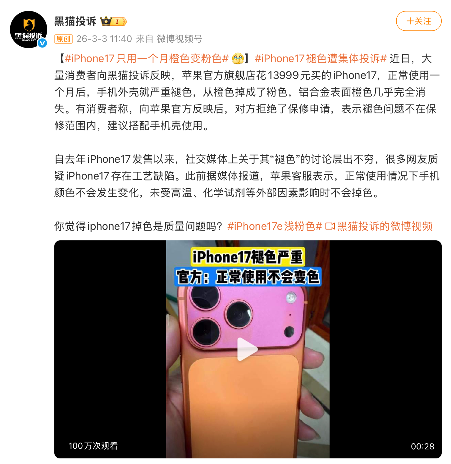 感觉每隔一段时间,iPhone 17这个褪色的问题就会出来被投诉一次。17 Pro系列的这个橙色,从发售不久之后就被曝出有掉色褪色问题。不过相对它的销量,遇到这部分的用户,应该也算少数吧。是不是跟个人使用环境和习惯有关。日常看到挺多也是在用橙色的好像没有遇到这个问题,还是很亮眼的。iPhone17只用一个月橙色变粉色