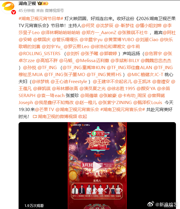 【3月3日19:30 湖南卫视元宵喜乐会】邓佳鑫 穆祉丞 张子墨 黄朔)、檀健次、徐梦桃、王心迪、韦礼安、薛凯琪、夏之光、徐志胜、张峻豪、周深、曾舜晞等。