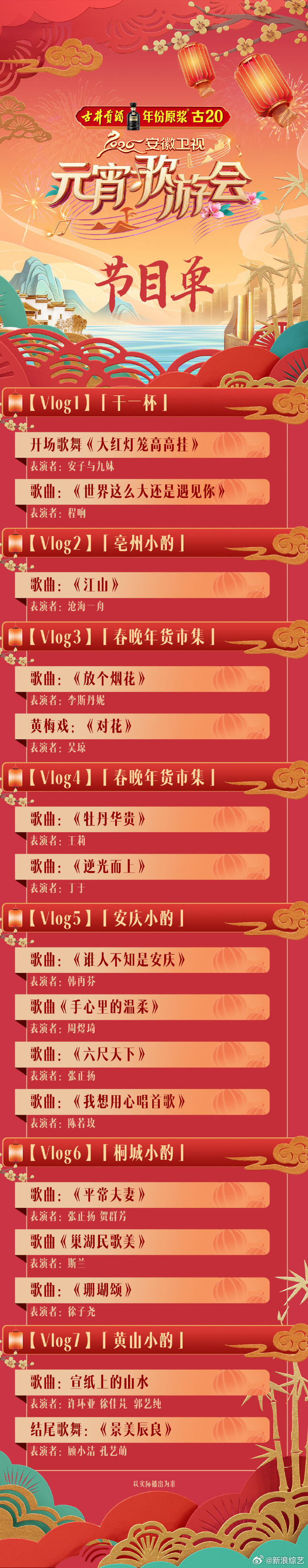 【3月3日20:00 央视元宵晚会】阵容:赵雅芝、徐梦桃、李雪琴、宋轶、希林娜依高、欧阳娜娜、张远、李云霄、陆虎、胡夏、白举纲、任贤齐、周笔畅、魏晨、刘宇宁、王铮亮、姜妍、毛不易、孟鹤堂、祝绪丹、谭维维、吴碧霞、韩庚、刘惜君等。