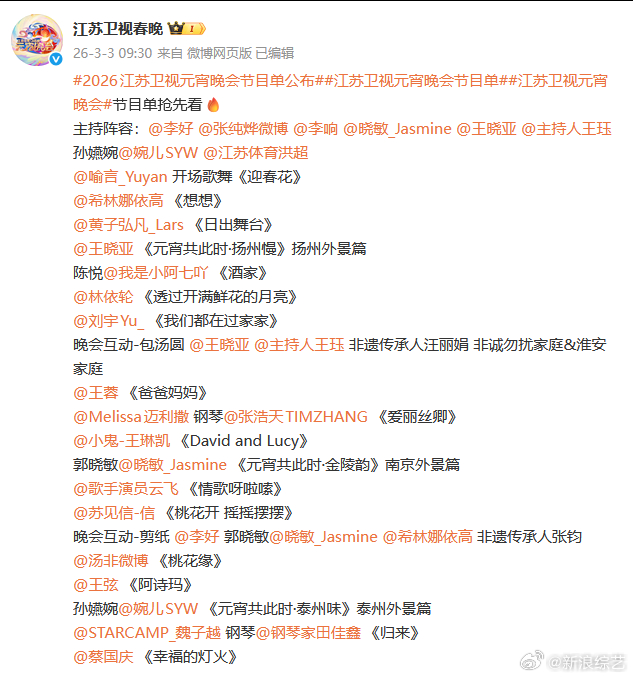 【3月3日20:30 江苏卫视元宵晚会】阵容:喻言、希林娜依·高、黄子弘凡、刘宇、王琳凯、蔡国庆等。