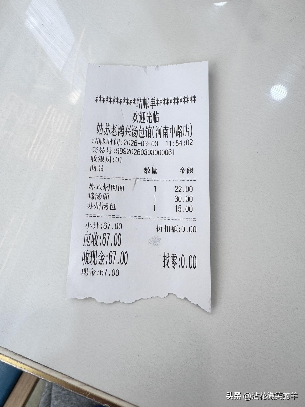 正月十五,两个小老人,“马年走马”路过苏姑老鸿兴汤包馆,点了两碗面,一定小笼包(6只),简单的午餐,共计消费67元,坐标上海河南中路。 恰是饭点,面馆内客人不少。服务称得上热情。 味道呢?中规中矩,无功无过。 跟你们那儿相比,这价格是什么水平? 上海物价 物价