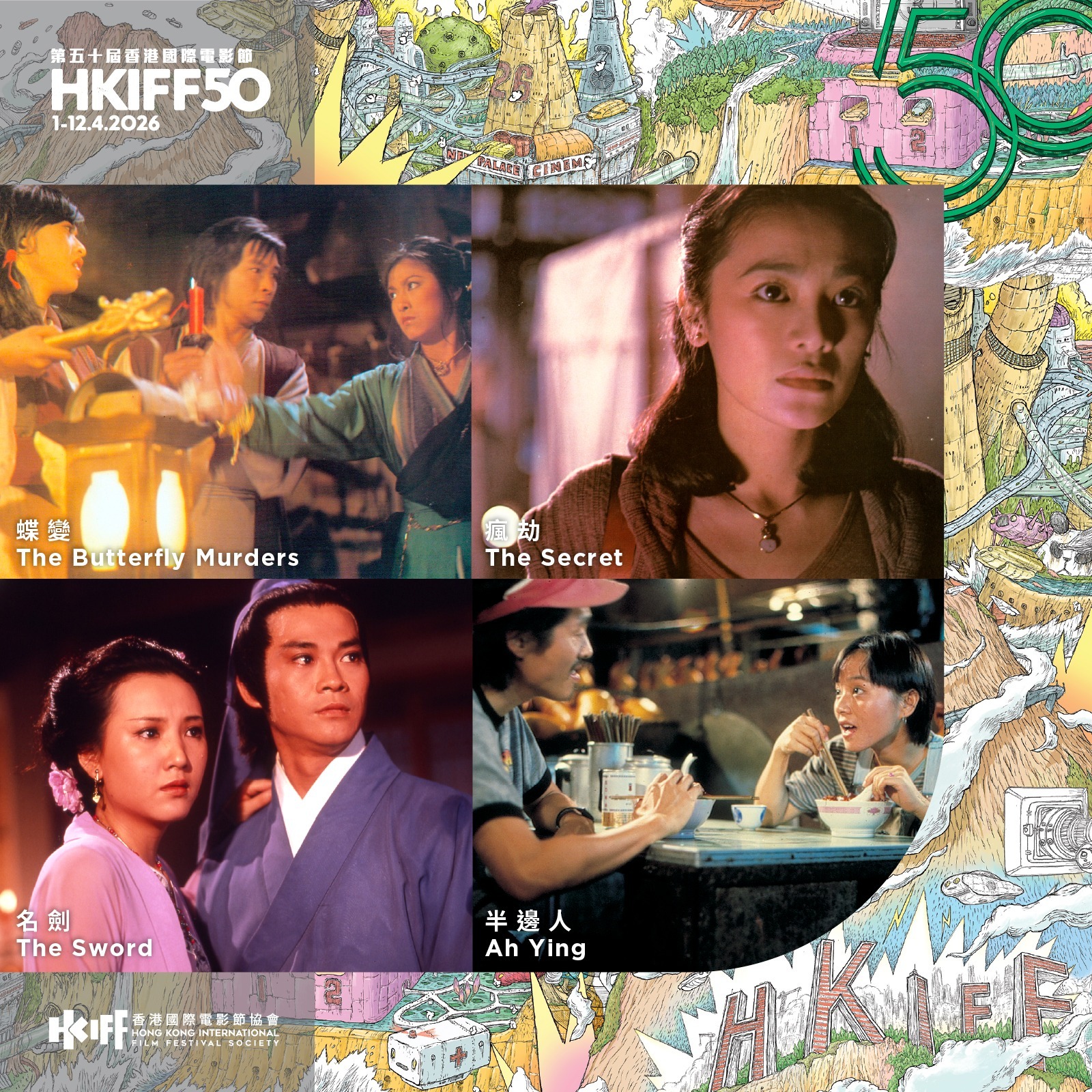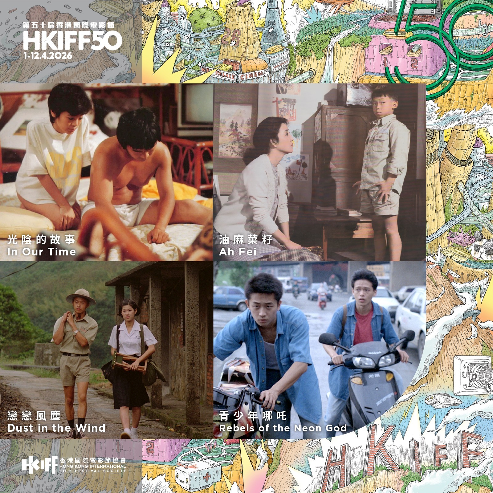 为庆祝五十周年,香港国际电影节呈献特备节目「华语电影:长风破浪启航时」,精选多年来策划推广的十二部中国内地、香港及台湾的𠎀作,这些作品跨越时代,早成影坛经典,正好展现电影节致力推动华语电影的丰硕成果。