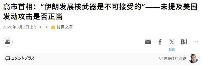 高市早苗表态,一边倒向美国与以色列。 3月2日,高市早苗在日本国会的众议院预算委员会上,专门就美以打击伊朗的事做了回应,全程语气强硬,却只对着伊朗“开炮”。 她一口咬定,伊朗发展核武器是绝对不能容忍的,还一个劲敦促伊朗赶紧停止核开发,别再做那些“破坏地区稳定”的事,连伊朗反击周边国家的行为也被她狠狠指责了一番,最后还装模作样地呼吁各方坐下来谈,用外交对话解决争端。 说真的,听完她这番话,我真的忍不住想问一句:高市首相,你是没看到美以干的好事,还是故意装瞎? 美以对伊朗的空袭已经进入第三天,截至当天,伊朗已有131座城市被波及,伊朗红新月会确认的死亡人数就有555人,到处都是被炸毁的居民住宅,德黑兰、卡拉季等多个城市,每天都能听到此起彼伏的爆炸声,无辜百姓流离失所,连基本的生命安全都得不到保障。 更让人愤怒的是,美以不仅炸平民区,还盯上了伊朗的核设施,3月1号就空袭了伊朗纳坦兹核设施,虽说国际原子能机构表示暂时没发现核设施有严重损坏,但这种直接针对他国核心设施的行为,本身就是赤裸裸的挑衅,是破坏地区稳定的根源。 可高市早苗对此半个字都没提,仿佛美以发动的这场屠杀,根本就不存在一样,更讽刺的是,伊朗之所以会反击,完全是被逼无奈。 美以从2月28号就开始发动军事打击,截至3月2号,以军已经动员了11万名预备役,用了2500枚弹药,号称摧毁了伊朗600个目标,甚至打死了伊朗情报部门的高级官员。 被逼到绝境的伊朗,才启动“真实承诺4”行动,用弹道导弹反击以色列的政府建筑和军事基地,还击落了美军的MQ-9“死神”无人机,这明明是正当防卫,到了高市早苗嘴里,却成了“破坏地区稳定”。 其实稍微想一下就明白,高市早苗之所以这么双标,根本原因就是日本离不开美国的庇护,更离不开中东的能源。 大家可能不知道,日本超过95%的原油进口都来自中东,其中70%都要经过霍尔木兹海峡,而现在伊朗已经宣布禁止任何船只通过这条海峡,日本的能源供应直接面临中断的风险,日本三大航运公司都已经暂停了相关航线。 所以高市早苗的表态,看似是在维护“核不扩散”和“地区稳定”,本质上就是在讨好美国,生怕得罪自己的“大哥”,断了自己的能源后路。 她一边喊着“绝不允许伊朗发展核武器”,一边对日本自己储备的核材料足以制造数百枚核弹头的事实避而不谈;一边要求伊朗停止反击,一边对美以违反国际法、滥杀无辜的行为视而不见,这种选择性失明,说穿了就是自私自利。 而且高市早苗的这番表态,也暴露了日本一贯的外交底色——从来没有自己的立场,只看强者的脸色。 之前俄乌冲突的时候,日本跟着美国高调谴责俄罗斯,又是制裁又是喊话,可现在面对美国发动的非法军事打击,却连一句批评都不敢说,反而倒打一耙,指责被侵略的伊朗,这种前后矛盾的操作,彻底撕下了日本“尊重国际法”的伪装。 美以发动的军事打击,已经给伊朗人民带来了巨大的灾难,也让整个中东地区陷入了动荡,而高市早苗的表态,无疑是在火上浇油,助长了美以的嚣张气焰。 说白了,高市早苗的这番话,既不是为了地区稳定,也不是为了核不扩散,只是为了日本自己的利益,为了讨好美国,可这种牺牲公平正义、欺负弱小的做法,终究会被国际社会看清,也终究会付出应有的代价。 毕竟在这个时代,没有谁能一直靠依附强者立足,尊重每一个国家的主权和领土完整,秉持公正中立的立场,才是一个大国应有的担当,而日本,显然还差得很远。 大家对此有什么看法呢?欢迎各位在评论区留言!