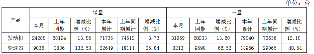 2026年2月,公司变速器销量9036台,同比增长132.53%;本年累计销量2.26万台,同比增长25.04%。具体数据如下: