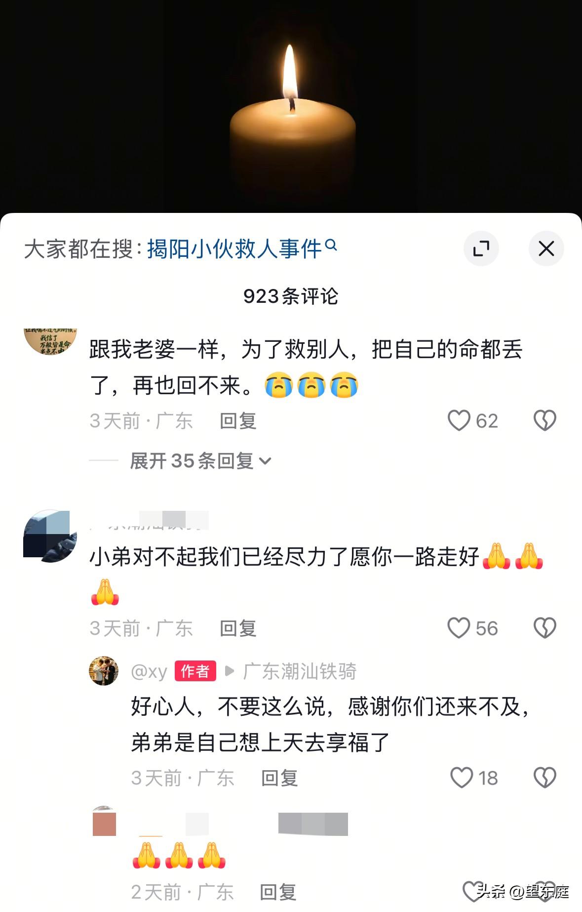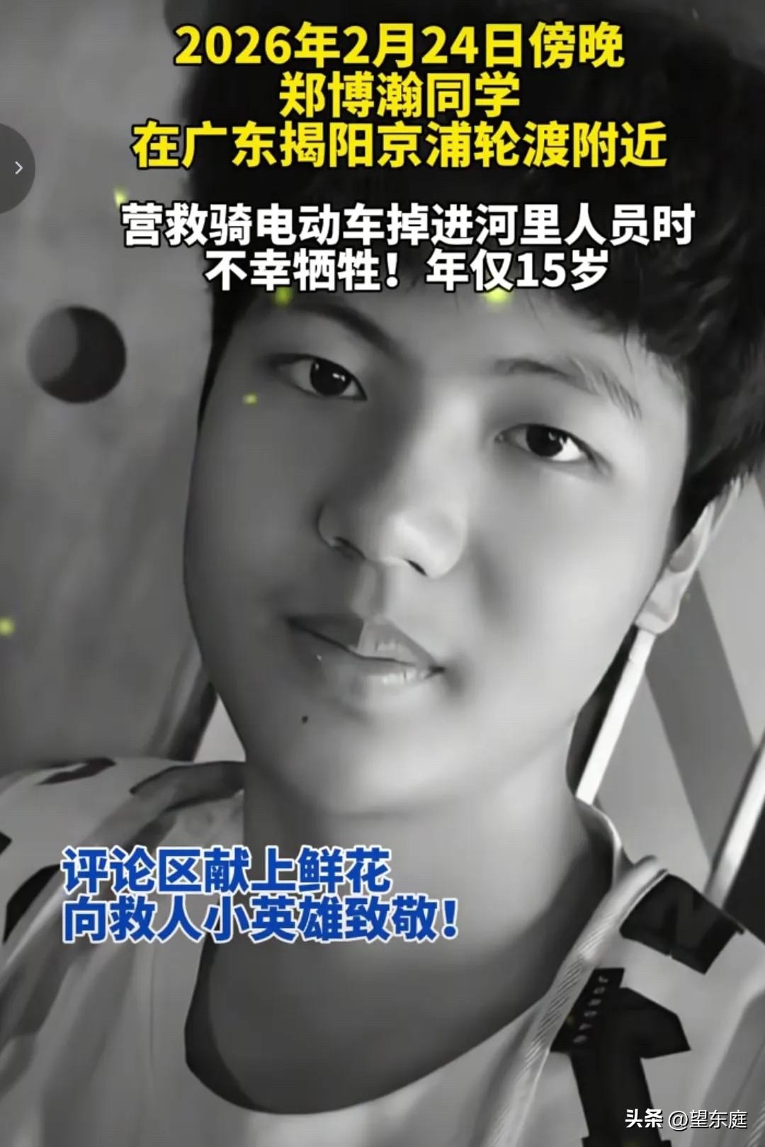 悲痛!这个阳光帅气的男孩就是广东揭阳因救人而牺牲的15岁少年——郑博瀚。大年初六那天,他为了拯救别人的生命,二话不说一头扎进了水里,结果对方得救了,他的生命却永远被定格在了冰冷的河水中! 悲剧发生在2026年2月24日,那天是大年初六。当天中午时分,他还和亲人一起有说有笑吃了午饭,没想到,那竟成了他和家人最后的相聚。 当天傍晚,有同学约郑博瀚去京浦轮渡附近游玩。在这个过程里,一位骑着摩托车的男孩不慎连人带车翻进了水中。 眼见对方就快要被水淹没了,郑博瀚没有丝毫犹豫就跳进了水中救人。 他一心只想保住对方的生命,连衣服外套都没来得及脱,就扎进了水中。纵使河水汹涌,可他一直在拼尽全力游向对方。 最终,落水的那个男孩有幸被路过的一艘船救了上来,而救人的郑博瀚却沉入了水中不见了…… 经过三天三夜的搜救,郑博瀚的遗体被找到了。年仅15岁的他,因为救人,再也没有了回家的机会! 悲剧发生后,有不少当地街坊邻居、同学家长都高度赞扬了他的为人。大家纷纷悲痛发声:郑博瀚从小就是个很乖的孩子,他很有礼貌,长得阳光又帅气。他家里是修电器的,虽然没有大富大贵,但一家人相亲相爱过的很幸福。 如果不是这个事情的发生,郑博瀚现在已经坐在宽敞明亮的教室里上课了。 在这个事件背后,真的让人无比心疼。作为陌生人的我们都如此难过,我都不敢想象他的家人是什么样的心情? 在此,说什么话语都略显无力。只愿,大家能够谨记这个心怀大爱的阳光少年。请永远记住他的名字,他叫:郑博瀚! 最后,愿他的爸爸妈妈、爷爷奶奶等亲人节哀顺便,一定保重好自己的身体![祈祷][祈祷][祈祷]