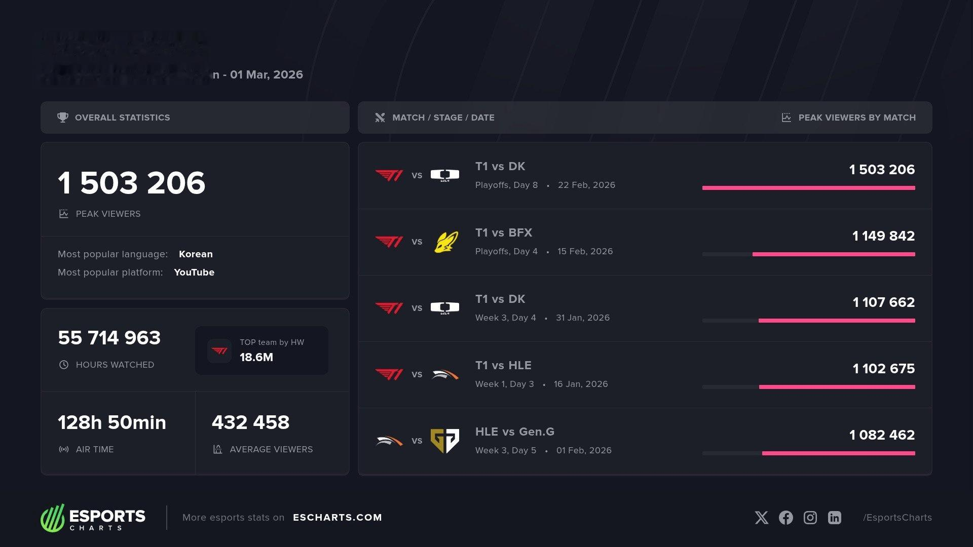 虎扑03月03日讯外媒统计LCK杯观众峰值排名前五的比赛,具体如下: